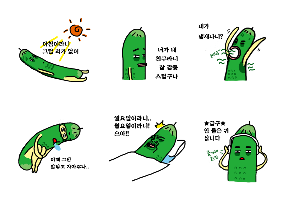 현재 카카오톡에는 안 움직이는 이모티콘으로 24개를 제안 신청 해놓은 상태이고, 라인과 아이메시지는 한국어로 낼 생각이 없기에 약간 변형된 형태로 번역 런칭을 도모하는 중이다. 텔레그램에서도 한번 써볼 생각이다. 카카오톡은 승인되고 판매되기까지 다른 플랫폼에 비해 꽤 길다고 한다. 카카오나 다른 데나 승인 거절을 당해서 세상의 빛(자본의 빛)을 보지 못할 가능성이 크기도 하다. 건투를 빈다, 어딘지 우울한 나의 오이들.