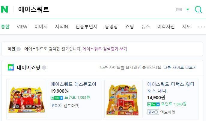 이미 '에이스쿼드'라는 유사한 이름의 완구가 강력하게 자리를 잡고 있어서 꽤 후순위로 노출이 된다. 새로운 서비스의 네이밍을 할 때는 아무리 마음에 든다고 해도 상표권 등록 여부와 해당 단어의 검색 결과를 확인하고 확정하도록 하자.