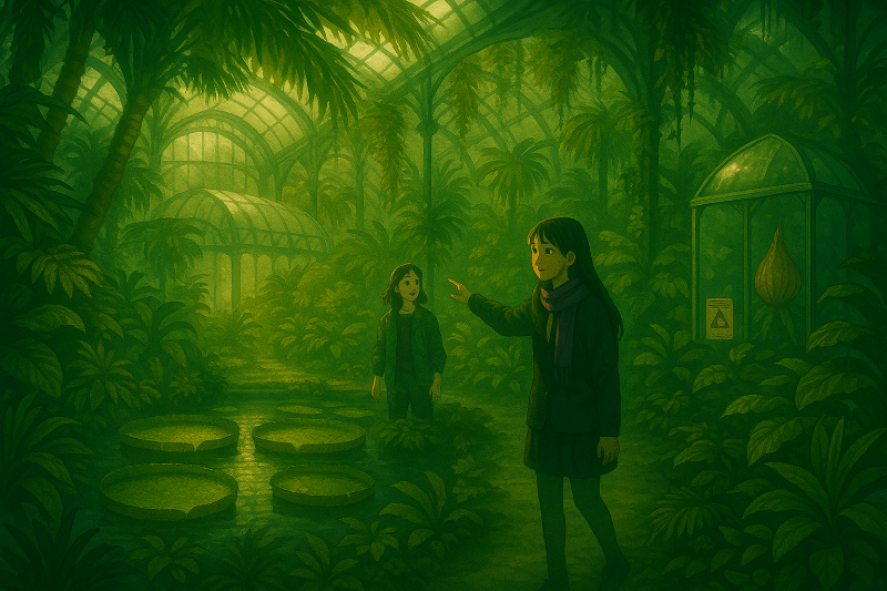수아는 주변을 살피더니 재빨리 문을 열었다. 안으로 들어가자 작은 온실이 나타났는데, 이곳에는 수생식물들만 있었다.