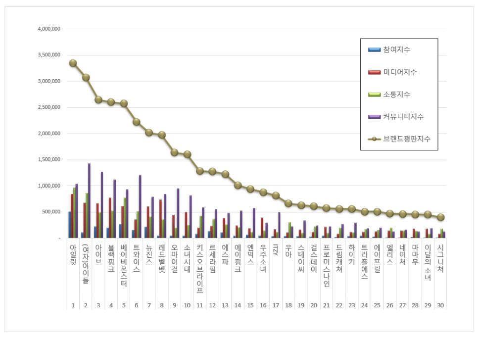 다른 걸그룹에 비해 커뮤니티 지수는 낮지만 소통, 미디어, 참여지수가 높아 1위를 했지. 즉 소비자(팬)들 사이(SNS, 커뮤니티 등)에서 상대적으로 공유나 이슈가 되는 건 적었지만 음원을 듣거나 언급은 많이 됐다고 볼 수 있지. 게다가 미디어들에서 긍정적인 뉴스를 많이 올린 것도 영향을 끼쳤다고 볼 수 있어.