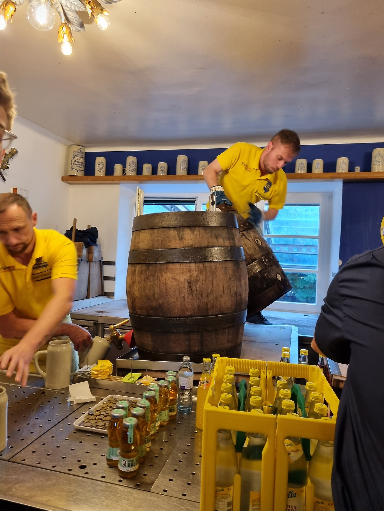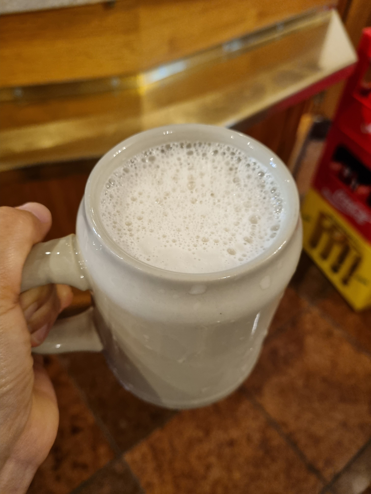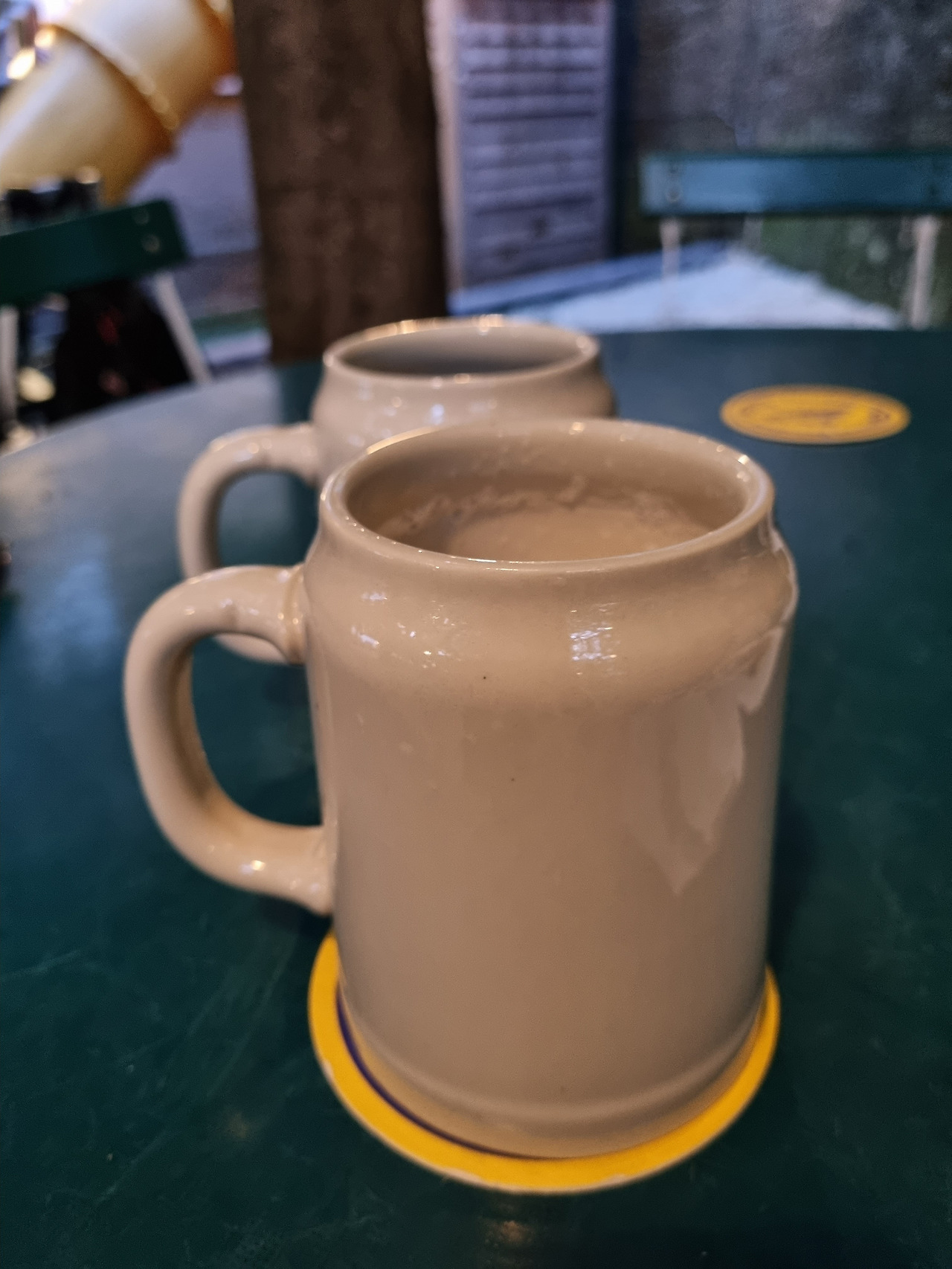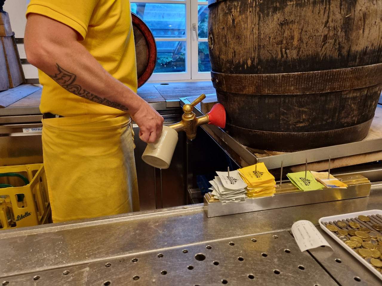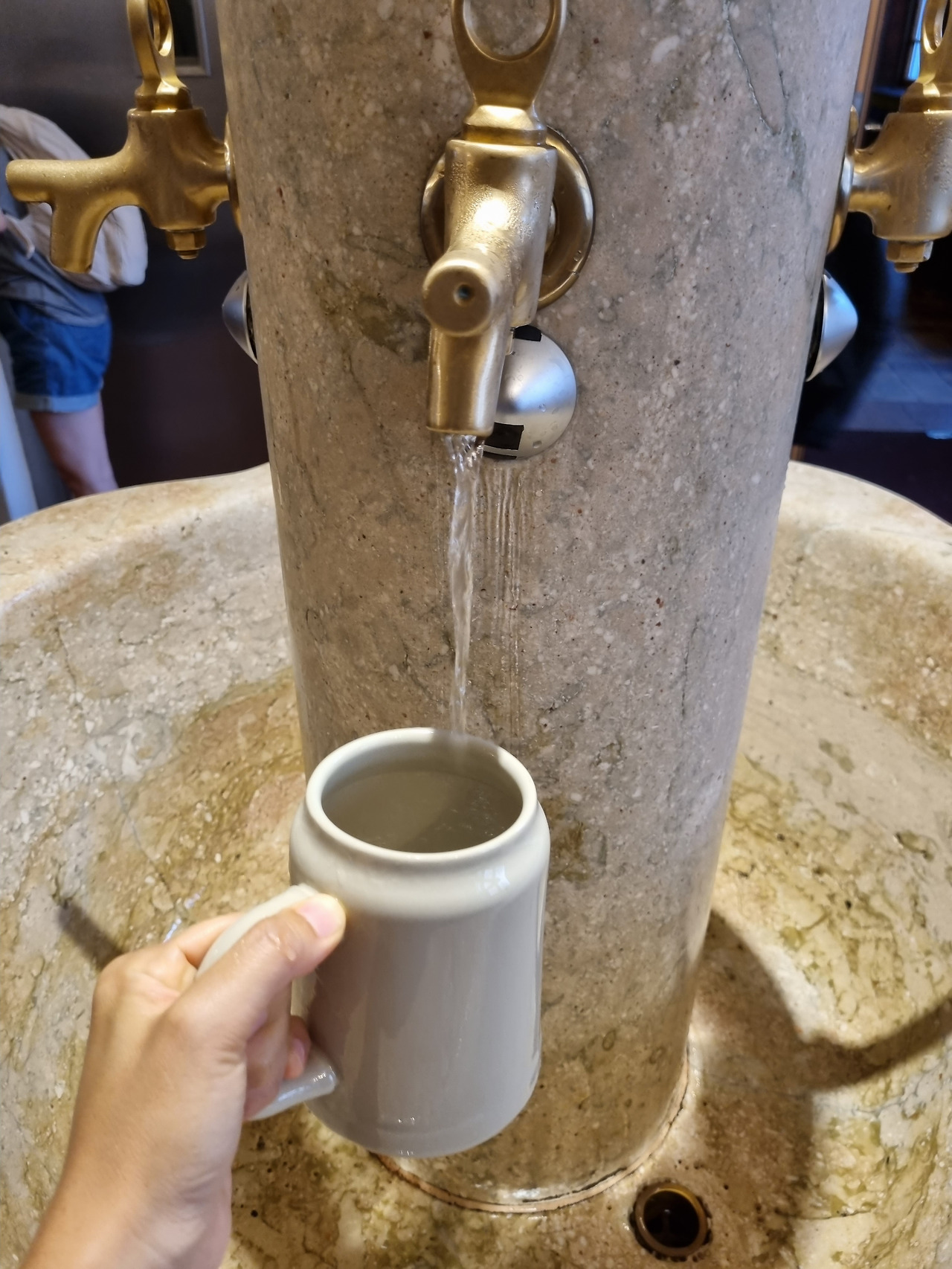건물 내부로 들어가면 아까 야외 정원의 모든 테이블 위에 단아하게 올려져 있던 흰 도자기 맥주잔이 길게 진열된 선반이 보인다. 키가 큰 잔(1L)과 작은 잔(500mL) 중 자기에게 적합한 잔 하나를 골라, 중앙에 예사롭지 않게 서 있는 수돗가로 가서 수도꼭지를 틀고 잔을 씻는다. 씻은 잔을 들고 계산대로 가서 맥주잔 사이즈에 맞게 맥주 가격을 지불한 후, 맥주를 내려주는 곳으로 가 테이블 위에 잔을 놓으면 바로 그 자리에서 나무 드럼통의 꼭지를 틀어 나의 잔에 신선한 맥주를 콸콸콸 내려준다. 보통 맥주에는 ‘따르다’는 말을 쓰지만, 큰 드럼통에서 바로 받는 이곳의 맥주는 ‘내리다’는 표현이 더 어울릴 듯하다.