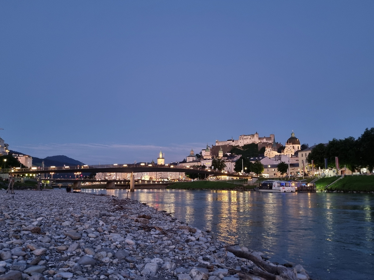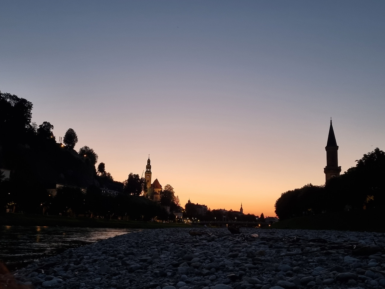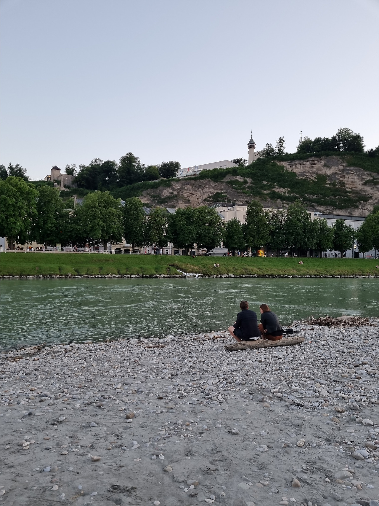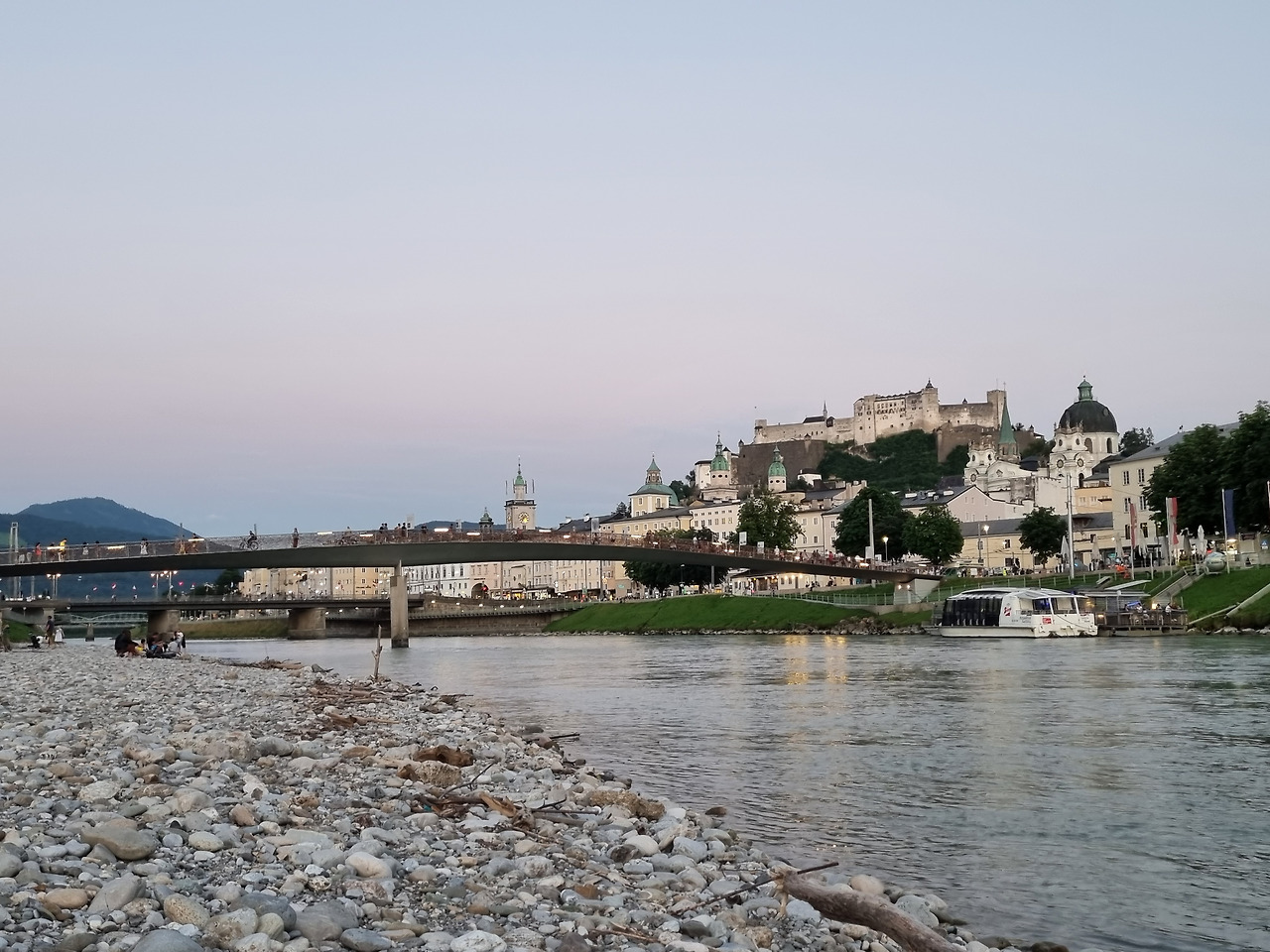 잘츠부르크 여행 첫날 저녁, 호엔잘츠부르크 성에서 아름다운 전경을 내려다보며 저녁을 먹은 친구와 나는 성 아래로 내려와 잘차흐강을 가로지르는 다리 위를 걸었다. 그러다 강변으로 내려가는 샛길을 발견했고, 그 길을 따라 강가로 내려 갔다.