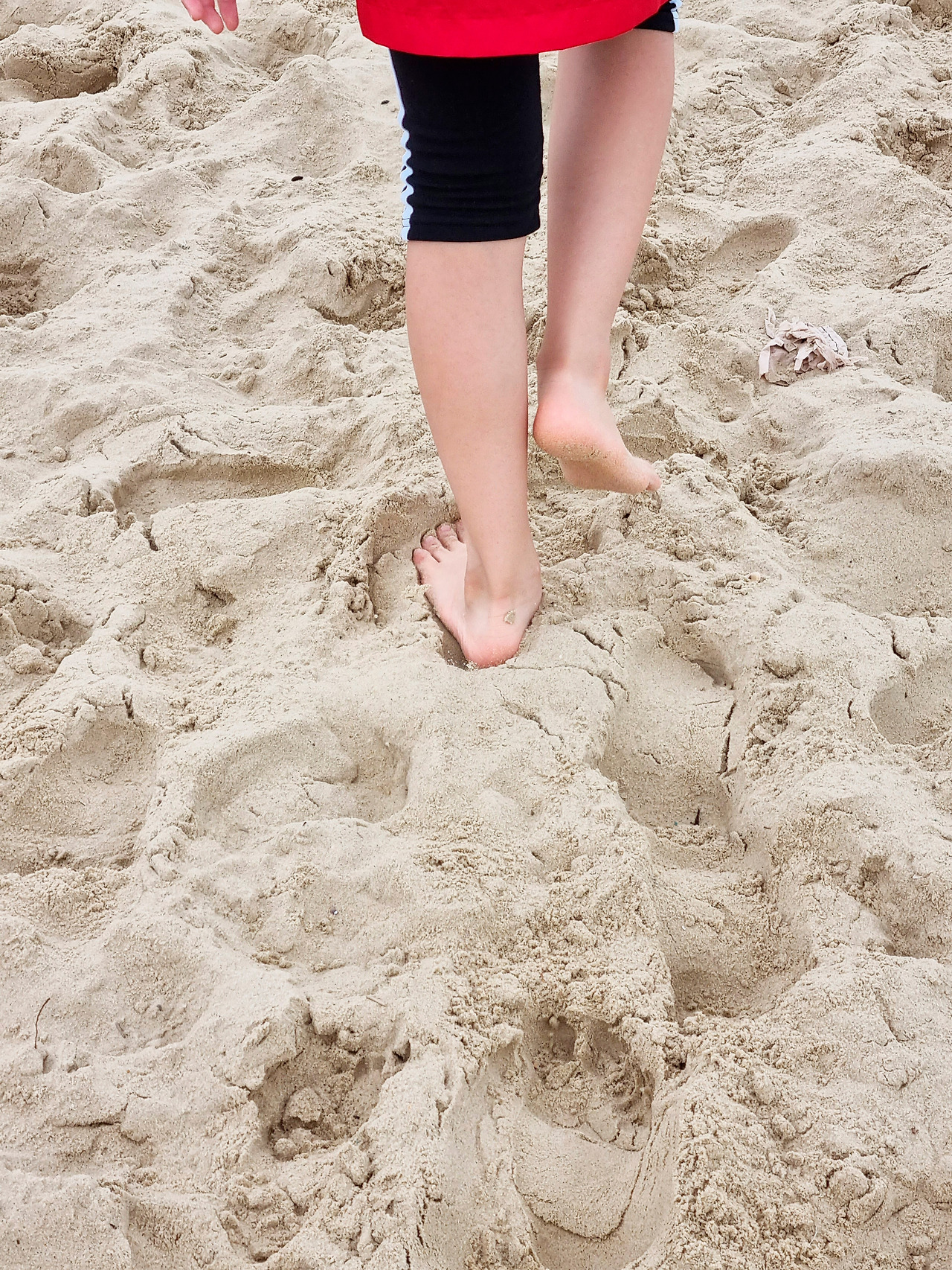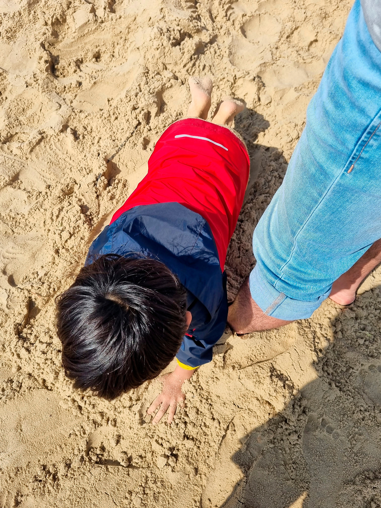 다행히 활발히 움직이는 아이들에겐 그 정도로 차갑게 느껴지지 않는지, 첫째 아이는 옆의 영국 아이를 따라 가슴 깊이까지 들어가 버렸다. 첫째 보다 어리고 겁이 많은 둘째는 누나를 따라 들어가다가 허리 위쪽까지 젖은 티셔츠에서 불현듯 추위를 느끼고선, 두 손을 들고 물 밖으로 나왔다. 그렇다고 노는 것을 그만 둘 순 없지! 이어지는 모래놀이로 둘째 아이는 순식간에 모래범벅이 되었다. 샌드 뱅크스 해변의 모래는 무척 곱고 잘 뭉쳐져 모래놀이를 하기에 제격이었다.