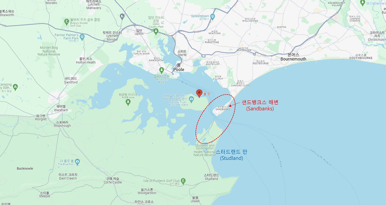 < 풀 하버(Poole Harbour)와 샌드뱅크스(Sandbanks) 해변 위치 (출처 : 구글 지도) >