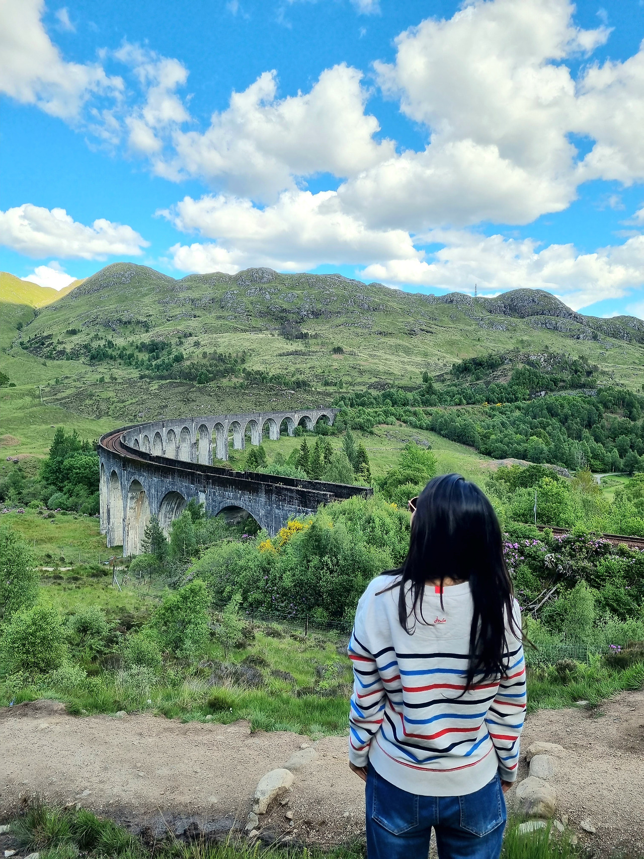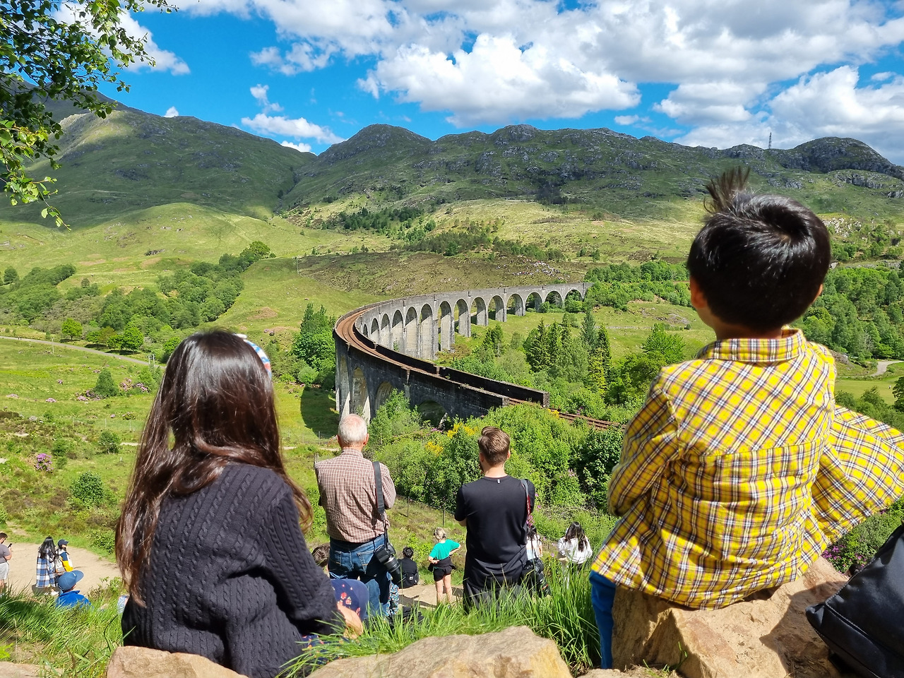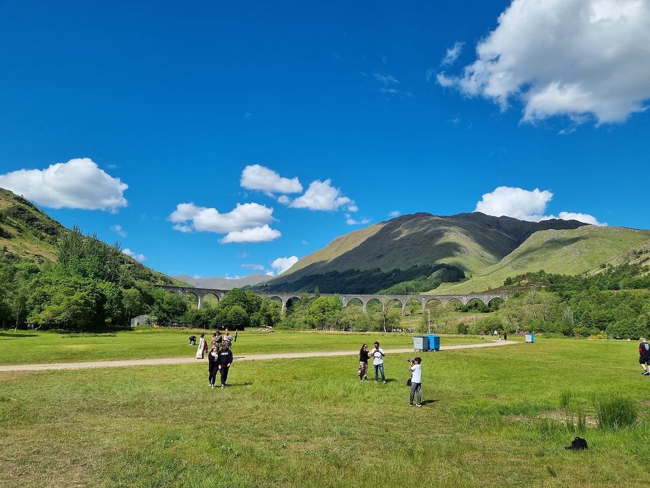 아직 사람들이 많이 오지 않은 뷰포인트에서 마음에 드는 위치를 선점하고 핸드폰 카메라로 찍은 고가교 사진이 구름그늘 때문에 아쉽다 생각할 때쯤, 내 생각에 동의한 날씨의 신이 명령한 듯 구름이 옆으로 비켰다. 태양의 조명이 가득 내리쬐는 글렌피넌 고가교의 풍경은 그야말로 아름다운 풍경이자 영화같은 장면이었다. 철교 주변으로 여러 개의 산봉우리들이 이루는 물결도 장관이었다. 감탄을 하며 찍고 찍고 계속 찍은 사진은 지금 봐도 정말 아름답고, 이 풍경을 직접 내 눈으로 보았다는 것에 때때로 가슴이 벅차오른다.