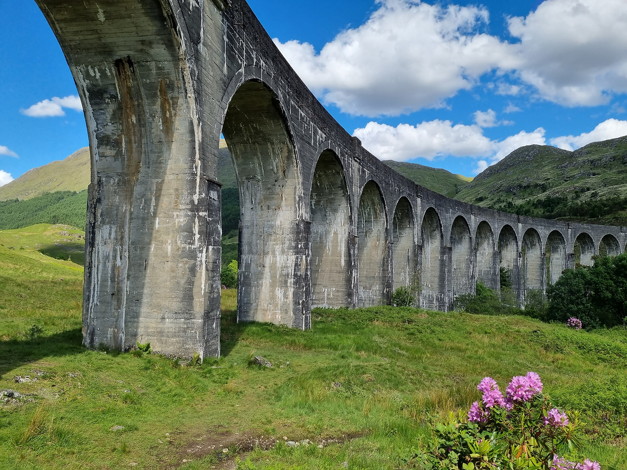 산악 지형이 많은 스코틀랜드에도 고가교가 여러 개 있는데, 특히 유명한 고가교가 우리가 찾은 글렌피넌 고가교다. 스코틀랜드 하이랜드 지역의 글렌피넌 마을 근처에 있어 ‘글렌피넌 고가교’라 불리는 이 고가교는 100여년 전인 1900년 전후에 건설된 것으로, 그전까지 영국 또는 유럽에서 건축에 주로 사용했던 재료인 석조 대신 콘크리트를 사용한 초기 대규모 구조물로 당시 기준으로 매우 혁신적인 고가교였다고 한다.