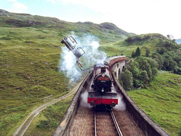 기차가 아닌 방법으로는 초행길인 둘은 호그와트 급행열차가 달리는 철길 위를 따라 날며 호그와트로 향하는 길을 찾았는데, 역시 달리는 것보다는 나는 것이 빠른지, 예상치 못하게 자동차 뒤편에서 자신들을 향해 맹렬하게 달려오는 호그와트 익스프레스에 해리와 론은 ‘뭉크의 절규’를 연상시키는 표정으로 허겁지겁 기차를 피한다.