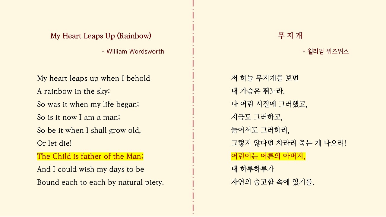 비록 나이가 들어가지만, 어린 아이일 때 품었던, 그 수순함을 끝까지 잃고 않고 지켜가고자 하는 다짐이 잘 드러난 워즈워스의 대표시 무지개에는 우리에게도 친숙한 문장이 나온다. 시를 잘 몰라도 한번쯤은 들어 봤을 문구, “어린이는 어른의 아버지”.