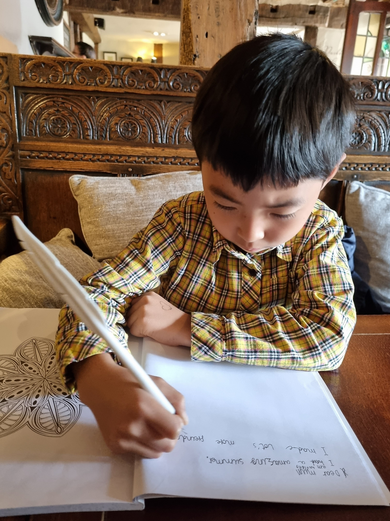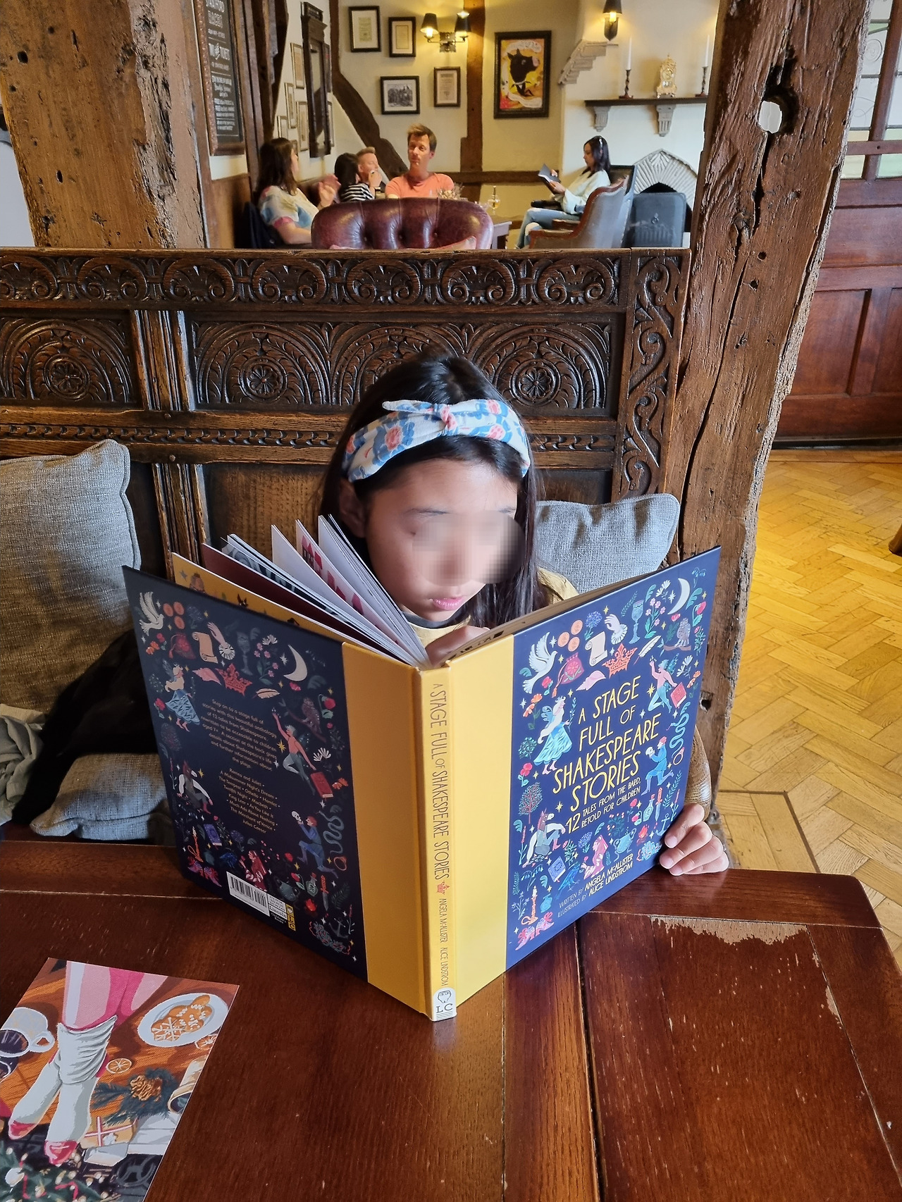 어른들이 맥주를 마시는 동안 아이들은 셰익스피어 생가에서 기념품으로 산 책을 읽고, 깃털 모양 볼펜으로 ‘셰익스피어처럼’ 편지를 썼다.