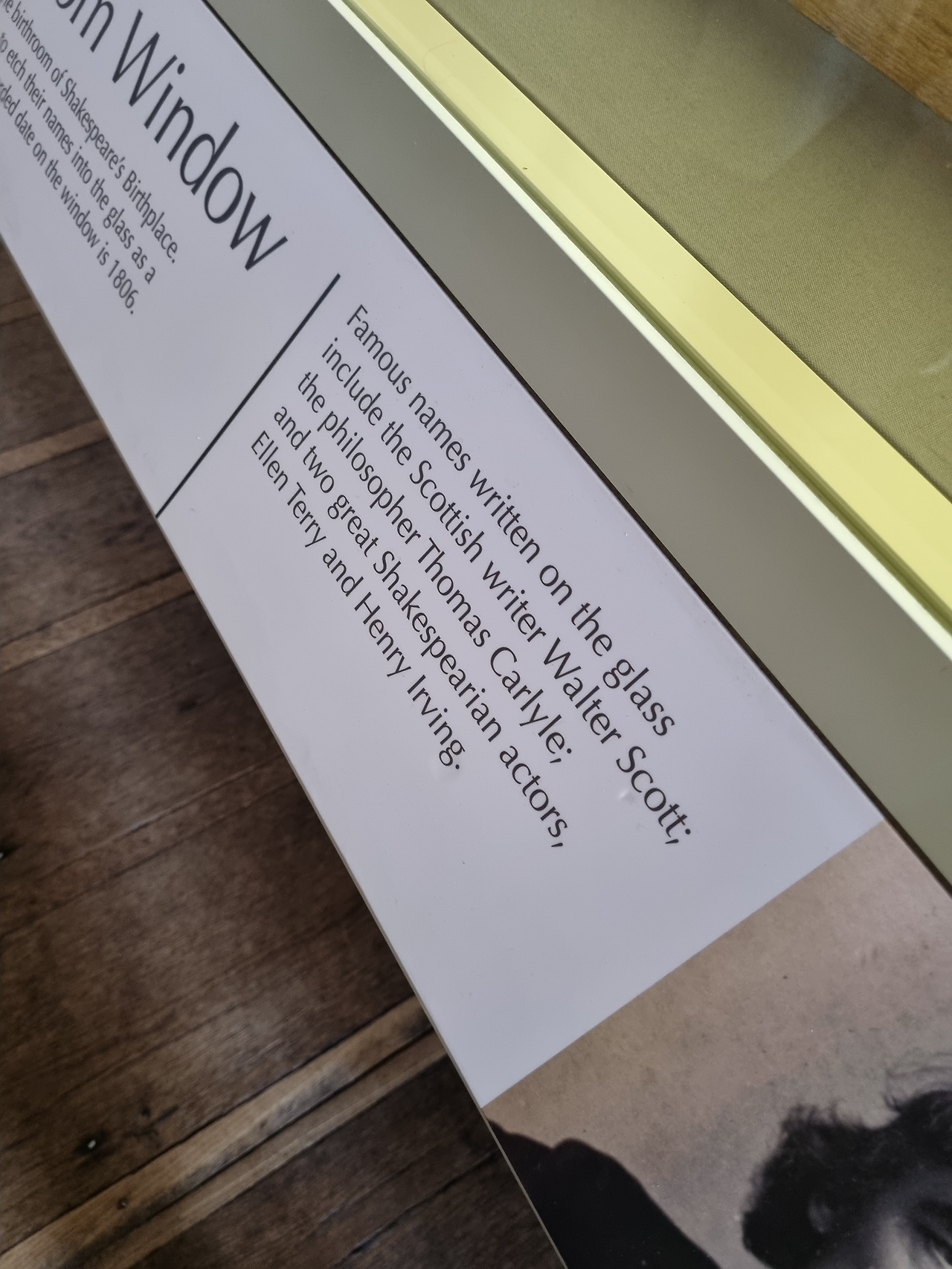 그러나 이곳에서 분명 격한 감동을 받은 이들이 많았으니, 그중 우리도 잘 아는 유명한 순례자가 있었다. 크리스마스 소설을 대표하는 <크리스마스 캐롤>의 작가 찰스 디킨스(Charles Dickens). - 초등학생 때 연말 학급연극에서 얼굴에 하얀 분을 바르고 스크루지 영감을 과거로 데리고 가는 유령 역할을 맡은 적이 있어, 내겐 늘 남다른 친밀감으로 다가오는 찰스 디킨스였다. – 찰스 디킨스 외에도 후대의 작가들에게 영향을 준 셰익스피어인 만큼 많은 작가들이 셰익스피어의 고향과 집을 방문하고, 이곳을 보존하기 위해 노력했다고 한다. 그들이 남기고 간 흔적이 셰익스피어가 태어난 방 창문을 가득 채우며 여전히 이곳을 지키고 있다.
