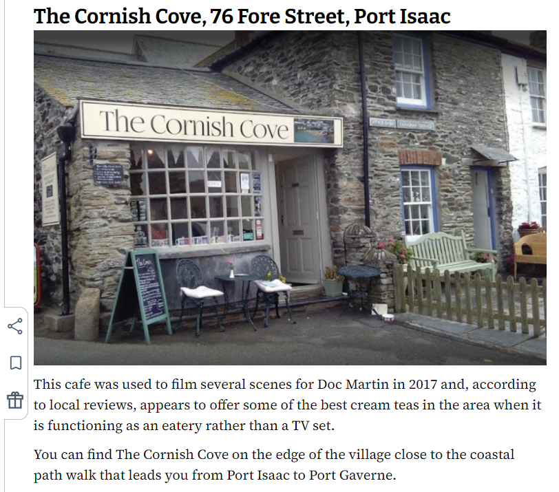 2004년부터 2022년까지 영국에서 방영이 된 TV 시리즈 <Doc Martin>은 까칠한 런던의 의사가 작은 어촌 마을로 내려가 마을 담당 의사가 되면서 일어나는 이야기를 다룬 드라마로, 사회성이 부족한 주인공과 그와 대비되는 다정한 마을 사람들이 부딪히고 어우러지는 과정을 유쾌하고 따뜻하게 풀어내어 아주 긴 시간 영국 사람들에게 사랑받았다. 특히 드라마 속에서 포트 아이작 항구 주변이 극의 중심 공간으로 나오는데, 이곳 특유의 건물과 슬레이트 지붕, 좁은 골목길 풍경 등이 아름답게 담겨 포트 아이작의 풍경을 감상하는 것도 이 드라마의 인기 비결 중 하나였다고 한다. 뒤늦게 발견한 또 하나 반가운 사실은 우리가 콘월적인 달콤함을 맛 봤던 아이스크림 가게도 <Doc Martin>을 촬영한 장소였다는 것.