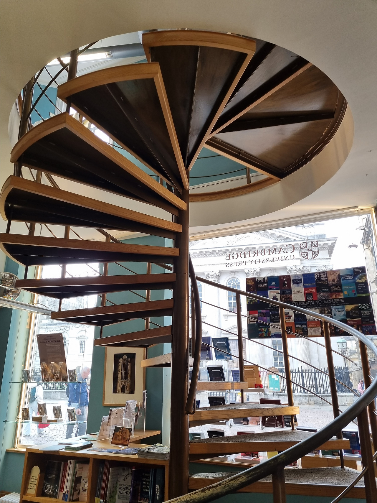 ‘Cambridge University Press Bookshop’은 대형서점이라 할 순 없지만 2층으로 구성된 꽤 큰 규모의 서점이었다. 전체적으로 세련되면서도 우아하고 엔틱한 느낌의 서점은 톤 다운된 민트색 벽이 서점 내부를 감싸고, 밝은 나무색 책장과 같은 색의 아치형 창문, 천장의 나무 서까래와 나무 바닥 등이 내추럴하고 고풍스러운 분위기를 더했다. 더 넓은 지식의 세계가 펼쳐지는 2층으로 연결되는 계단은 나선형태로 고요하고 정적인 서점에 리듬감을 더했다.