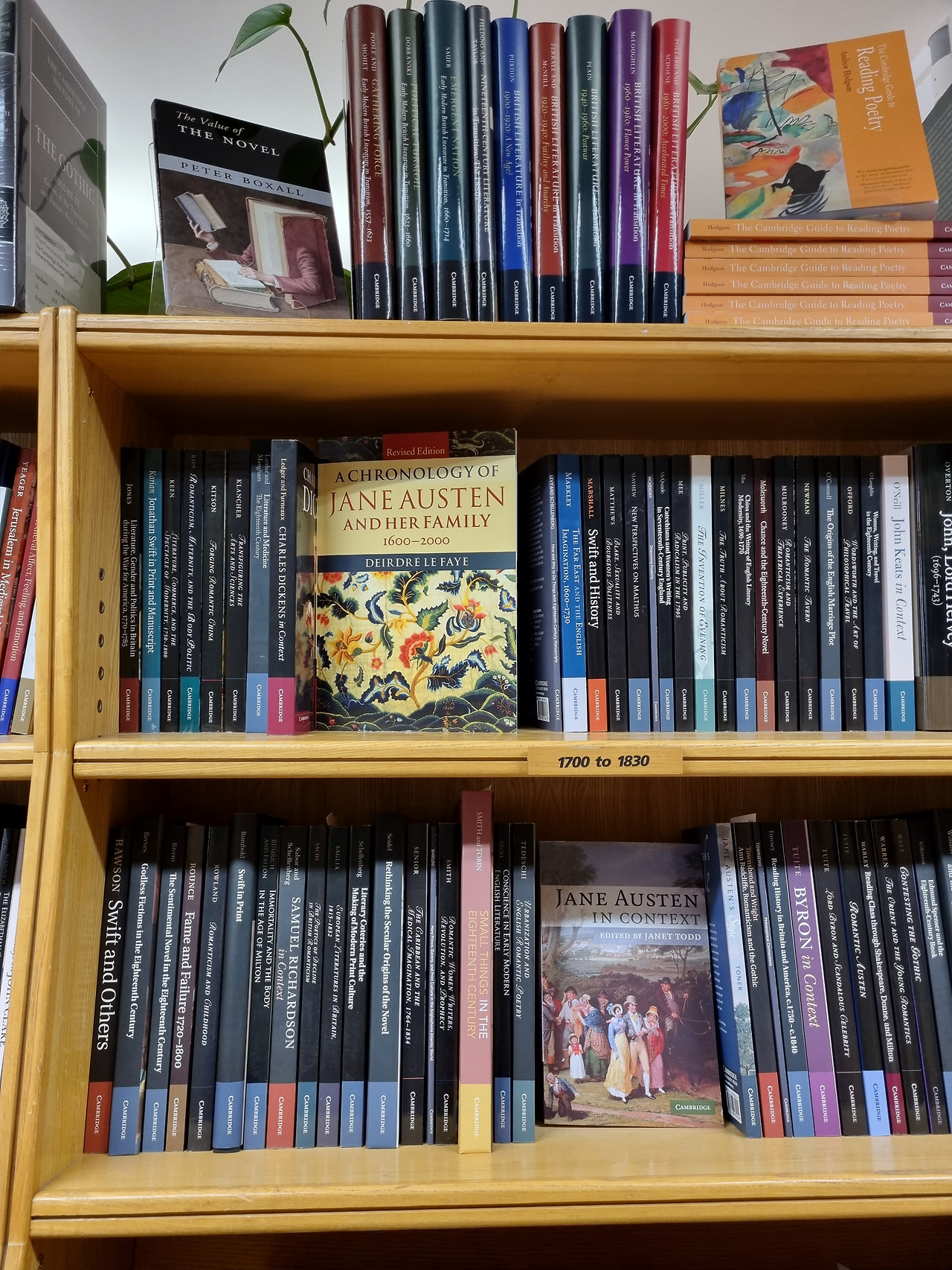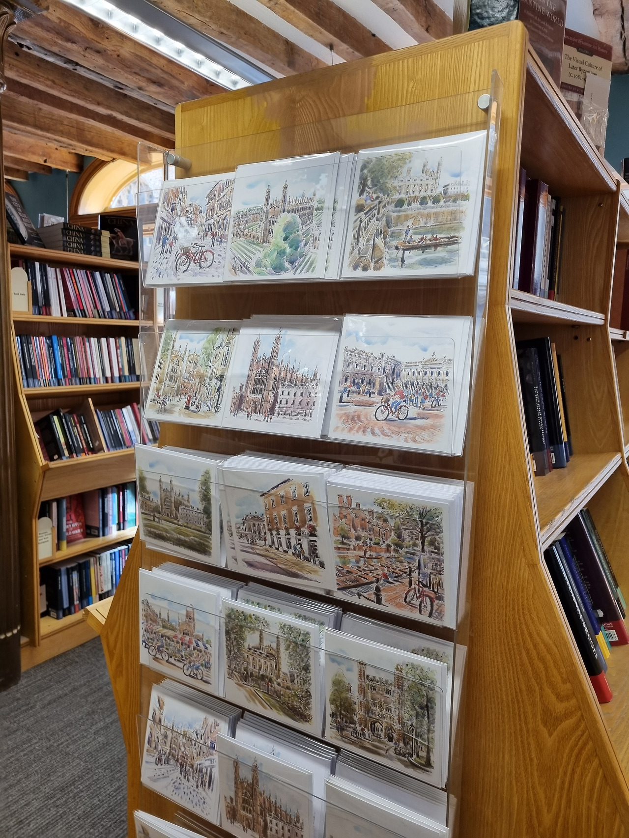 작은 글씨의 영어 책들이 빽빽한 책장 중간중간에 우리도 아는 유명한 영국 작가들, 셰익스피어, 제인 오스틴 등의 책이 보여 반가웠다. 그들의 초상화나 작품을 활용한 기념품, 또 케임브리지를 그린 엽서 등은 소장 욕구를 자극했다. (제인 오스틴 에코백을 사지 않고 돌아온 것은 아직까지도 한으로 남아 있다. 우리동네 바스(Bath)의 제인 오스틴 뮤지엄에 가면 같은 것이 있을 거라 기대했는데 없었다. 갖고 싶은 기념품은 그때그때 사야 한다.)