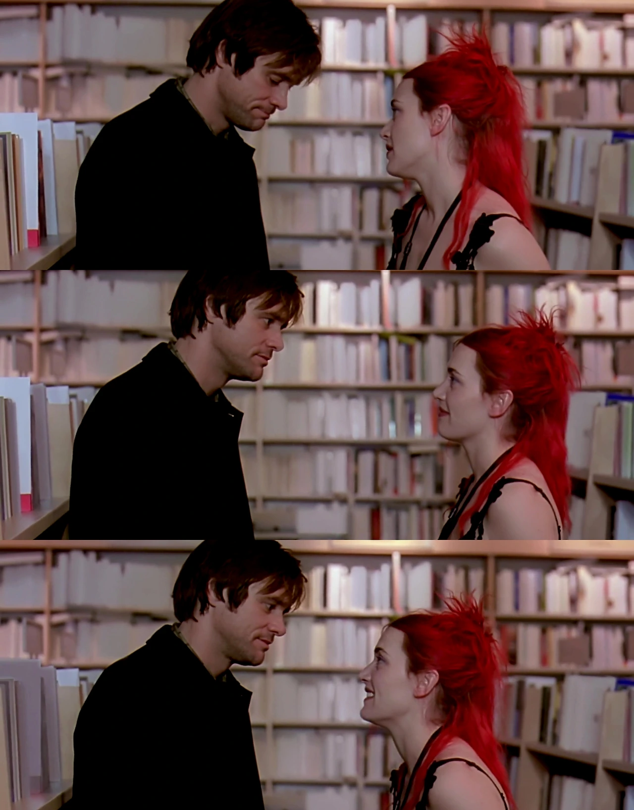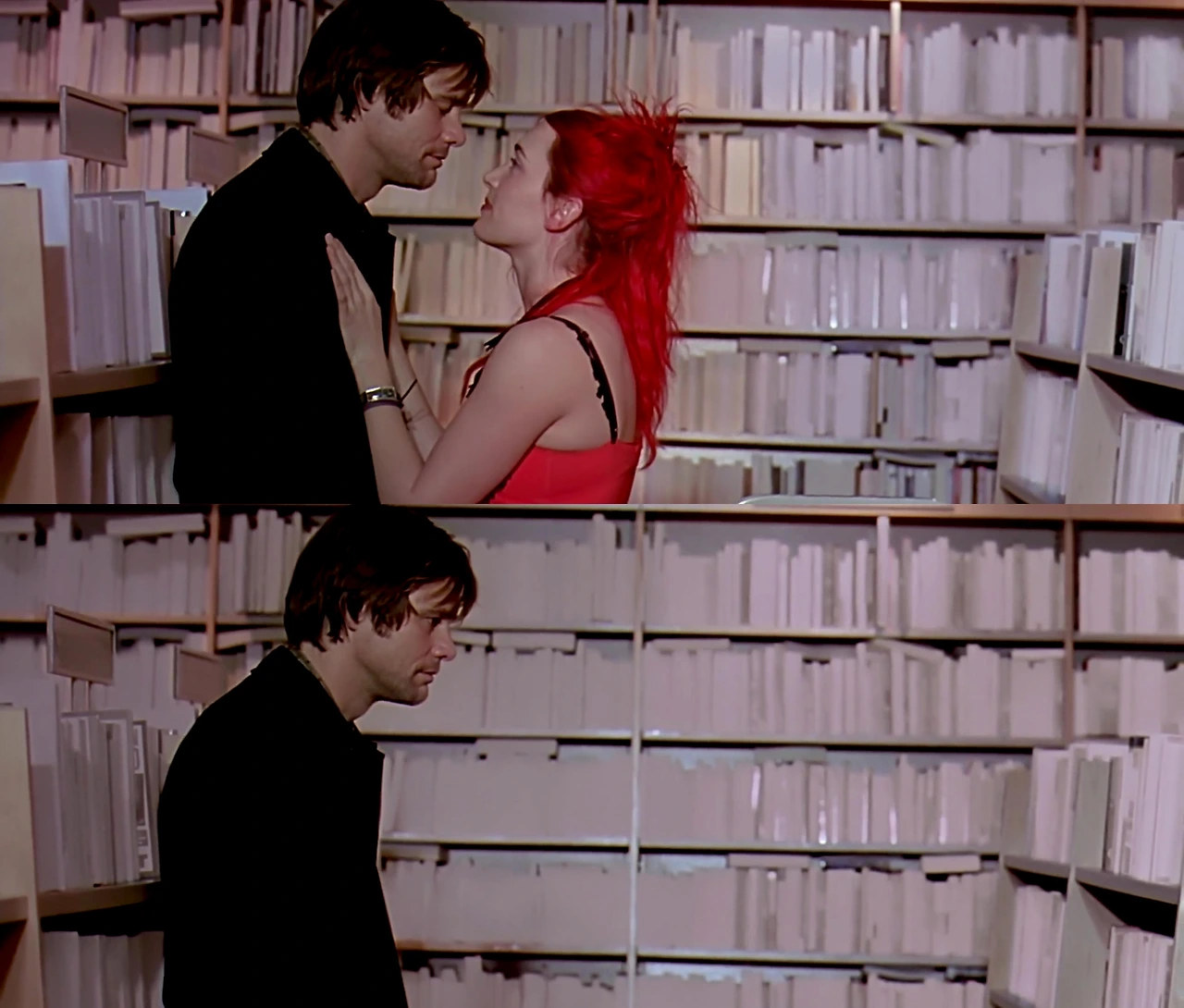 '누군가를 기억에서 지울 수는 있겠지만, 가슴에서 지운다는 것은 다른 이야기입니다.'(영문 포스터 카피 - You can erase someone from your mind. Getting them out of your heart is another story.) 클레멘타인에 대한 기억을 역순으로 지워나가던 조엘의 '정신'은 그들이 두 번째로 마주했던 서점에서의 기억에 가닿는다. 이 장면에서 인물들 뒤에 자리한 책들의 겉표지는 하나둘씩 하얗게 지워지고 있다. 평소 아날로그적인 시각 효과를 즐겨 쓰던 감독은 영화에서 서서히 지워져 나가는 조엘의 기억을 여러 '물리적인' 방식을 통해 표현했다. 건물을 무너뜨리고, 둘 이상의 공간의 세트를 뒤섞고, 핀 조명으로 부분 부분만을 비추기도 했는데, 그중 개인적으로 가장 인상 깊었던 그리고 가장 가슴 아프게 다가온 방식이 바로 이 서점 장면에서의 그것이었다.
