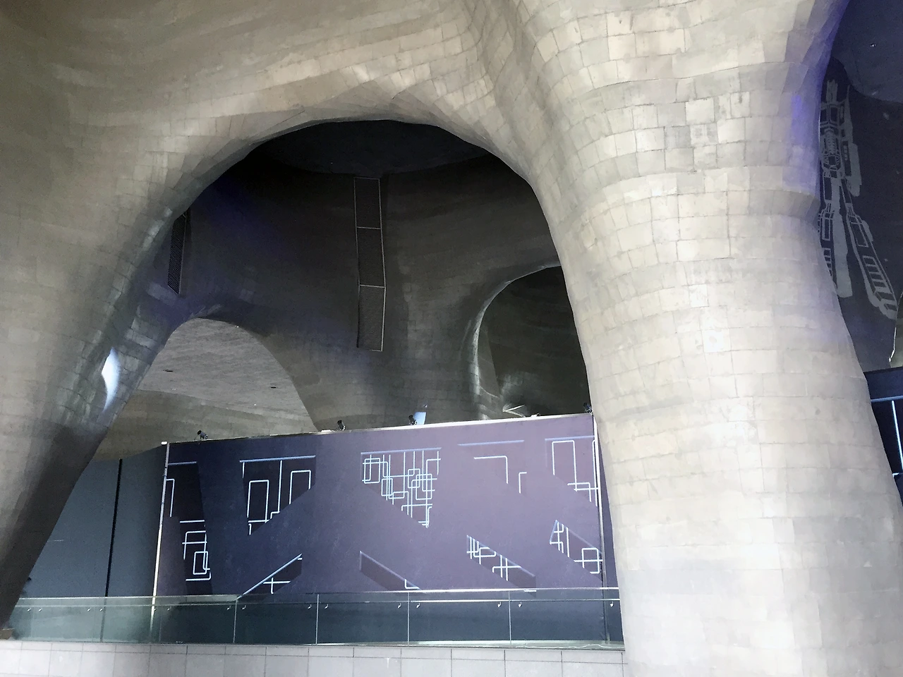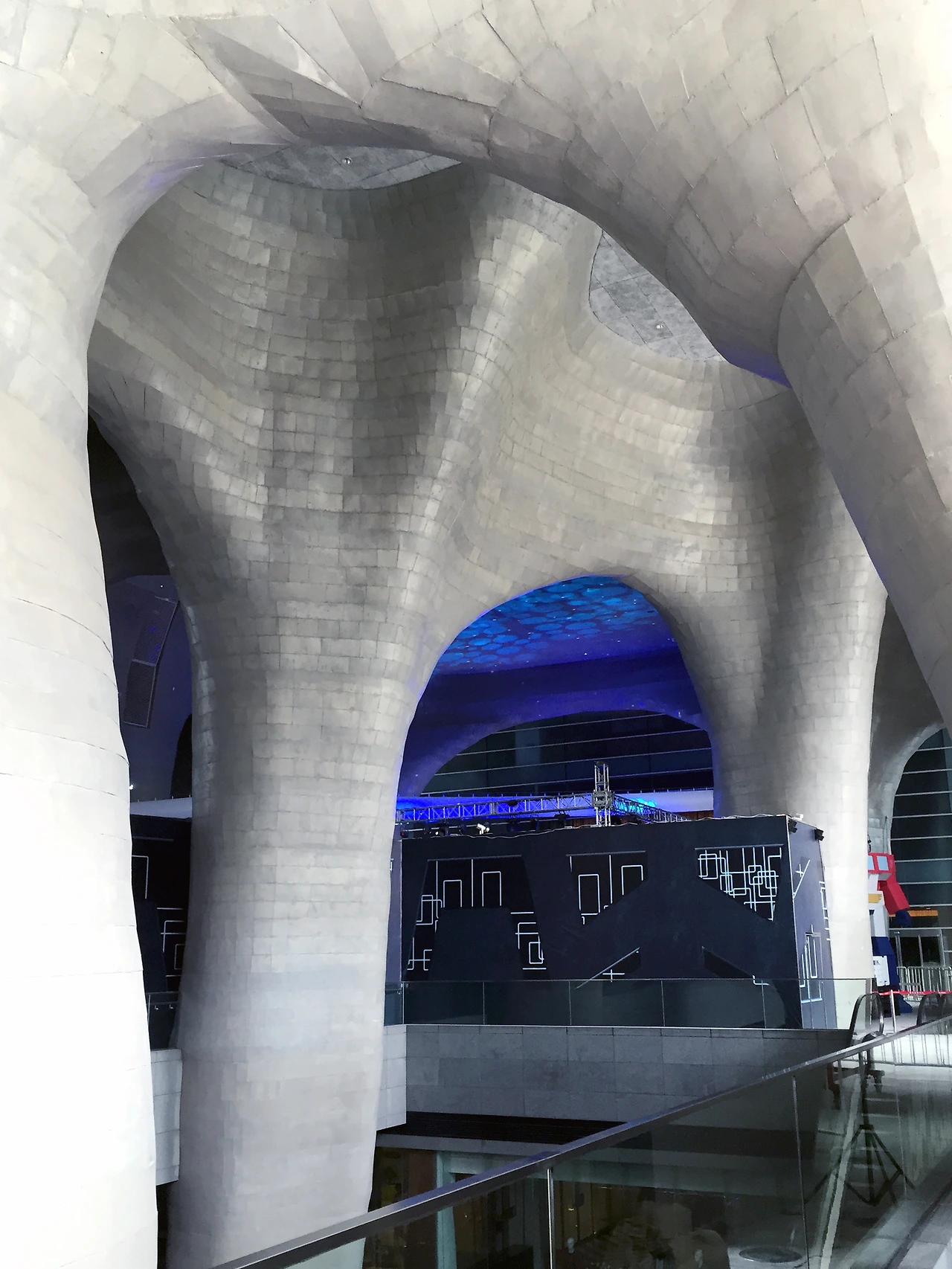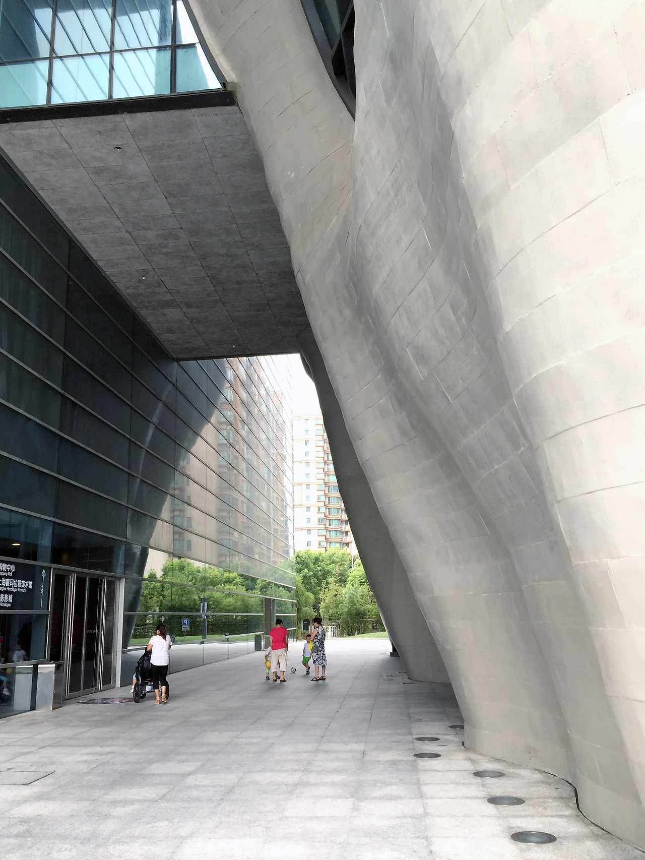푸동 지구와는 전혀 다른 종류의 미래적인 느낌이다. 동굴을 연상시키는 불규칙한 곡선의 기둥들이 신비로웠다. 이곳은 호텔과 쇼핑몰, 전시관 등이 함께 있는 복합 건물이었는데, 안타깝게도 1층에서 유료 전시가 진행되고 있어서 영화가 촬영된 지점들에 직접 가보진 못했다. (관심 가는 전시였다면 입장을 고려해보았을 텐데 하필 어린이들을 대상으로 한 로봇 만화 기획전이었다. 어쩐지 역에서부터 엄마 손을 잡고 온 애들이 많더라니...)