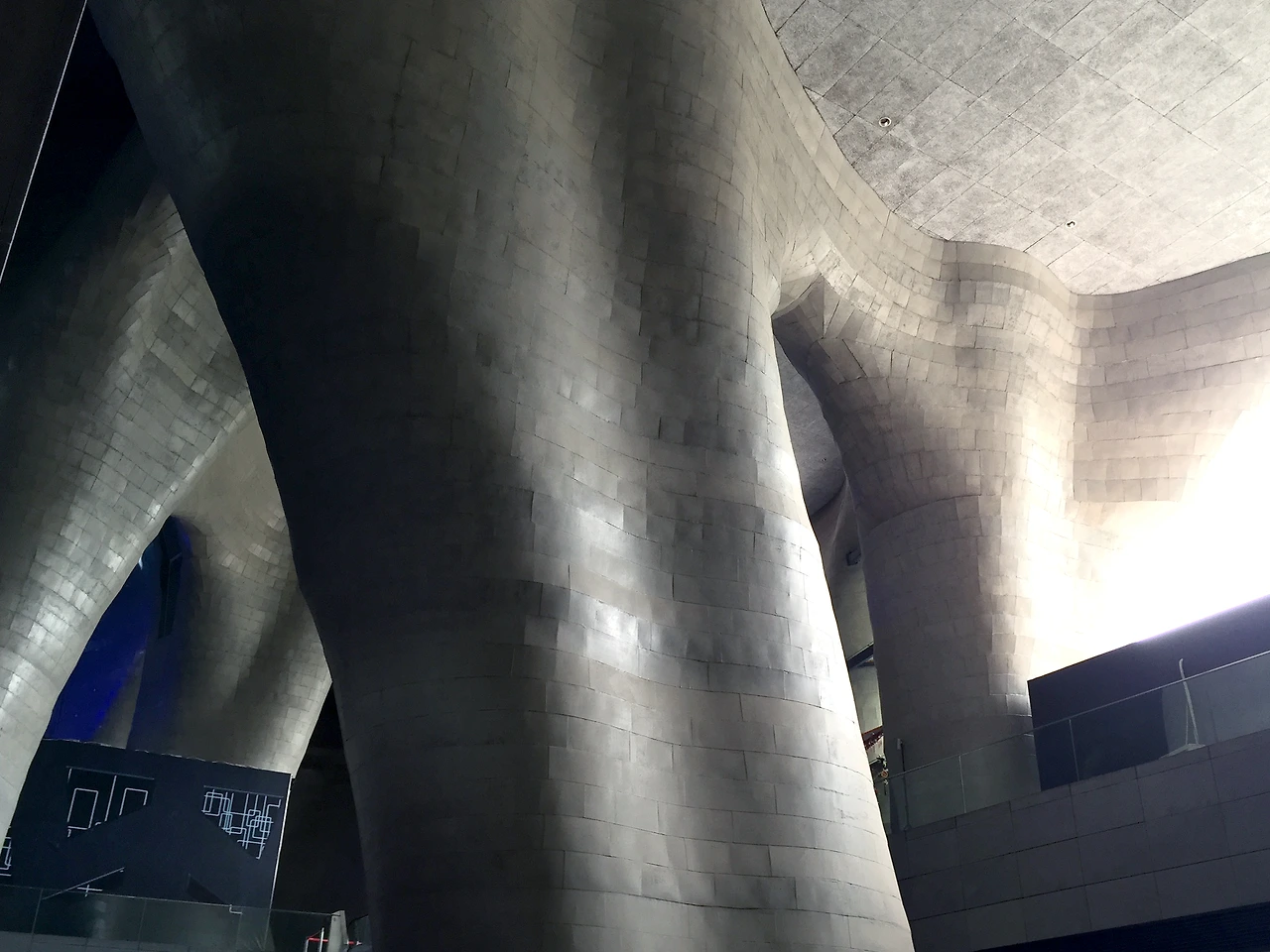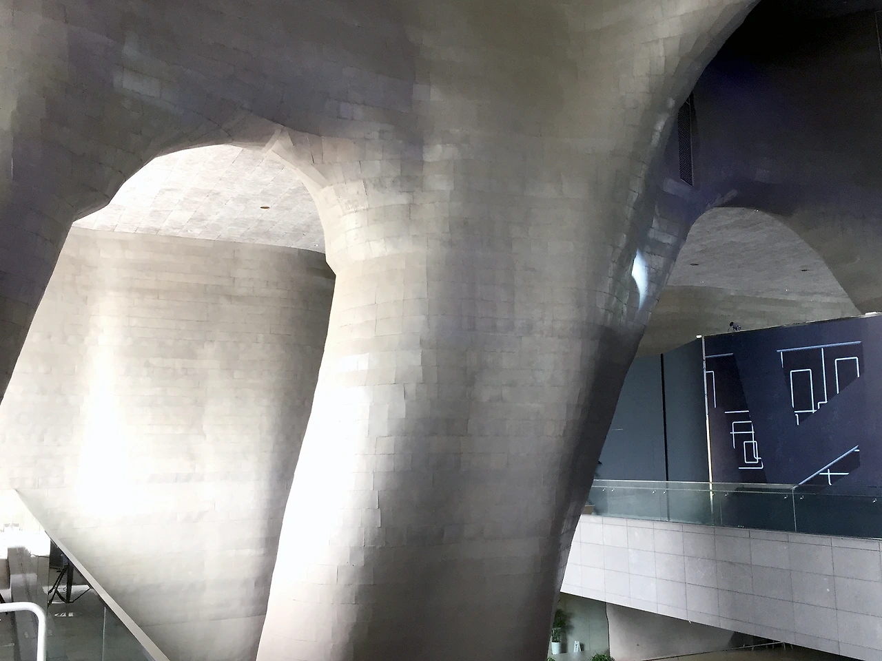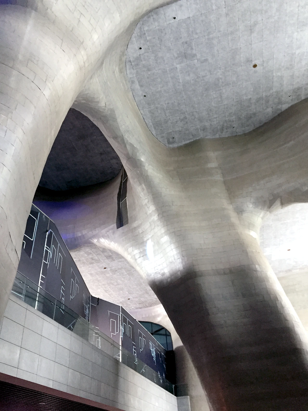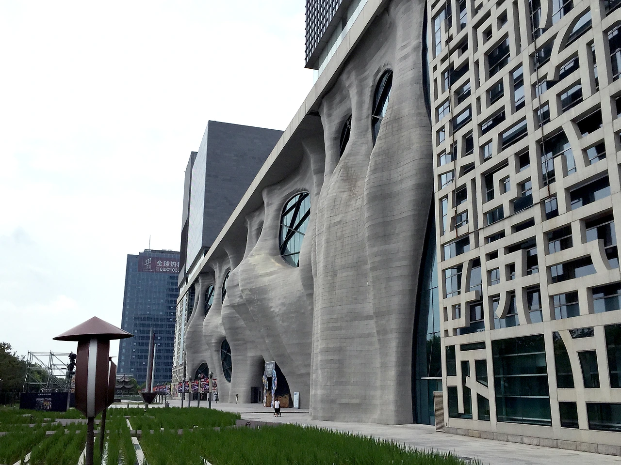 푸동 지구와는 전혀 다른 종류의 미래적인 느낌이다. 동굴을 연상시키는 불규칙한 곡선의 기둥들이 신비로웠다. 이곳은 호텔과 쇼핑몰, 전시관 등이 함께 있는 복합 건물이었는데, 안타깝게도 1층에서 유료 전시가 진행되고 있어서 영화가 촬영된 지점들에 직접 가보진 못했다. (관심 가는 전시였다면 입장을 고려해보았을 텐데 하필 어린이들을 대상으로 한 로봇 만화 기획전이었다. 어쩐지 역에서부터 엄마 손을 잡고 온 애들이 많더라니...)