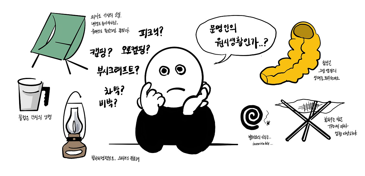 아무런 인프라(차, 집)도 없으면서 덜컥 장비를 구입했다가 혹여 장비가 나와 맞지 않는다면, 그걸 다시 내다 팔고 하는 것도 여간 번거로운 일이 아닐 거다. 감가상각까지 감안한다면, 어후, 속상할 것 같다. 나는 하나를 구입하더라도 그 쓰임과 의미를 제대로 알고 사야겠다고 마음먹었다. 난 짠순이니까. 제대로 캠핑을 다니게 되기까지 캠핑에 대해 나만의 정리를 하려고 한다. 캠핑은 어디에서 왔고, 캠핑장에서 하는 행위는 무엇이며, 그것을 위한 장비들은 어디서 온 걸까.