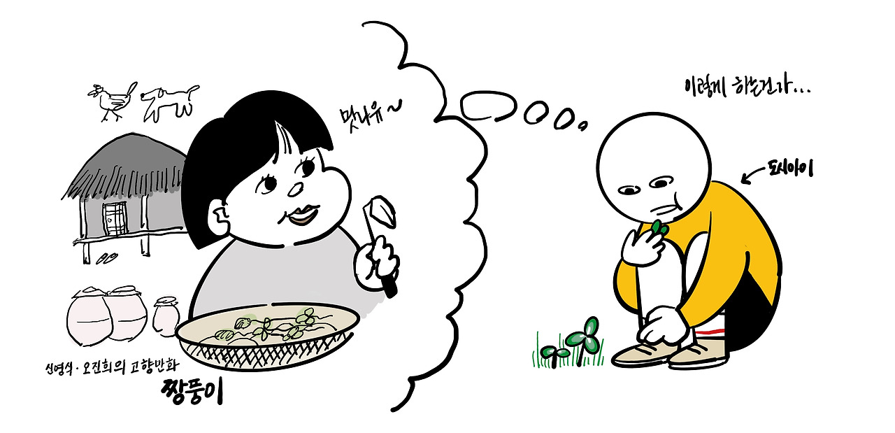 어릴 땐 주위에 명절마다 시골에 내려가는 친구들이 많았다. 다들 시골에 내려가면 쥐불놀이 깡통 한 번씩은 돌려보고, 복숭아나 오이 서리도 하고, 모내기도 해보는 모양이었다. 신도시에 살았던 우리 집은 큰집이었기에 시골에 내려갈 일도 없었고, 시골이야기를 들려주는 친척도 없었다. 다들 도시에 살았기 때문이다. 시골이 궁금했던 초등학생의 나는 시골을 그린 만화 '짱뚱이'를 닳도록 읽었다. 짱뚱이처럼 봄철 들판의 약초를 캐는 대신, 나는 신도시 인공 조경의 클로버를 씹어보며 나름대로 자연을 느껴보려고 했었다. 애초에 경험한 자연이 많지 않았기 때문에, 자연은 언제나 엉거주춤 접근하게 되는 존재였다.