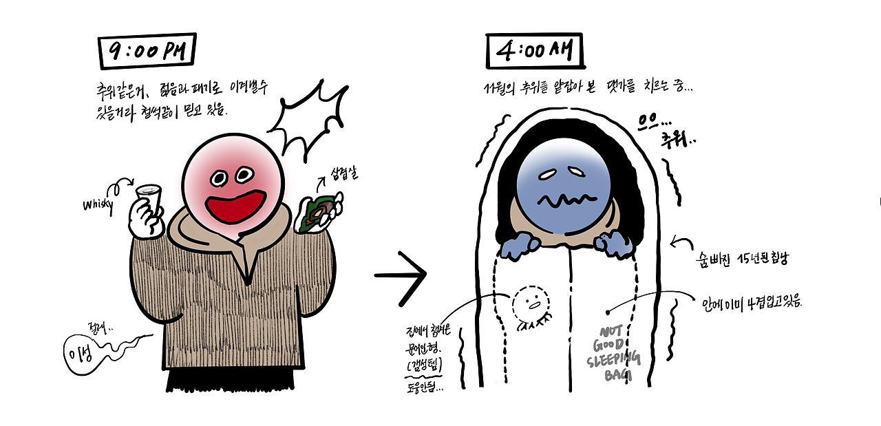 자연에서 보낸 만족스러운 시간 대비 육체가 괴로웠던 시간은 51대 49라고 이야기할 수 있겠다. 다행히 잠도 못 자고, 비를 맞은 채 집으로 돌아가야 했던 끔찍했던 시간이 추억을 지배하지는 못했던 것이다. 그 날 아침, 벤치 위에서 침낭 하나, 타프 하나로 늦잠을 자고 있던 아저씨를 봤다. 장비가 받쳐준다면 괴로움 수치 49는 어쩌면 5.. 정도로 낮출 수도 있지 않을까? 그렇다. 캠핑은 장비빨이다. 장비가 하나 누락될 때마다 육체의 고통은 10씩 증가하는 것이 캠핑란 걸 뼈저리게 느꼈다.