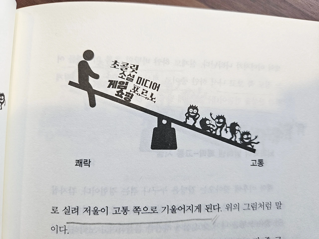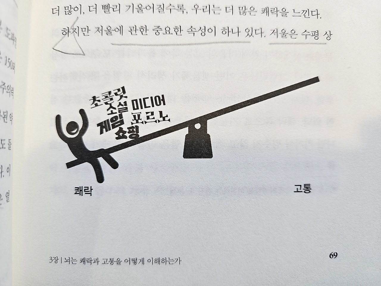 건조기후에 살아가는 선인장이 열대우림에 던져진 것처럼 우리는 과도한 도파민에 둘러싸인 환경에 살고 있다. 결과적으로 지금의 우리는 더 많은 보상을 얻어야 쾌감을 느끼고, 상처가 덜하더라도 고통을 느낀다.《도파민네이션》, 88P