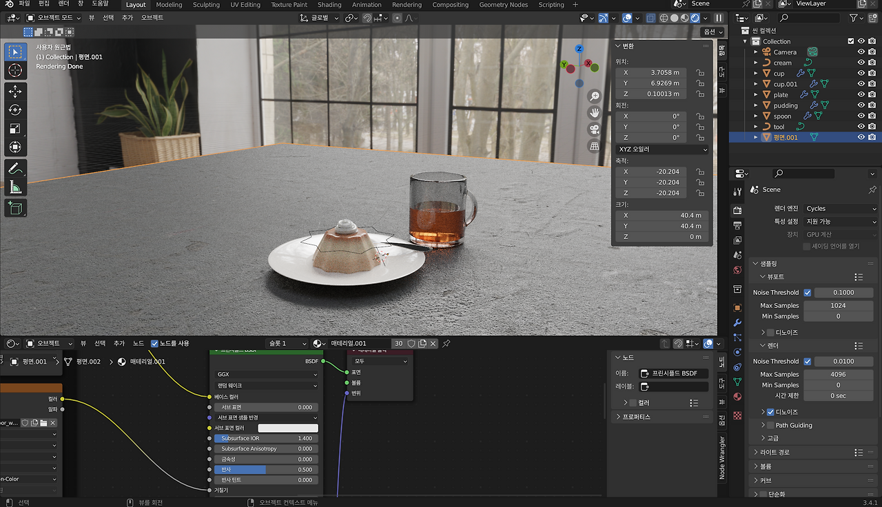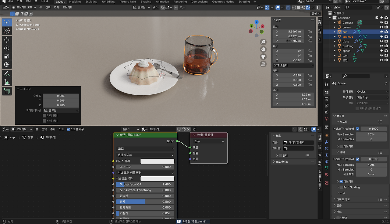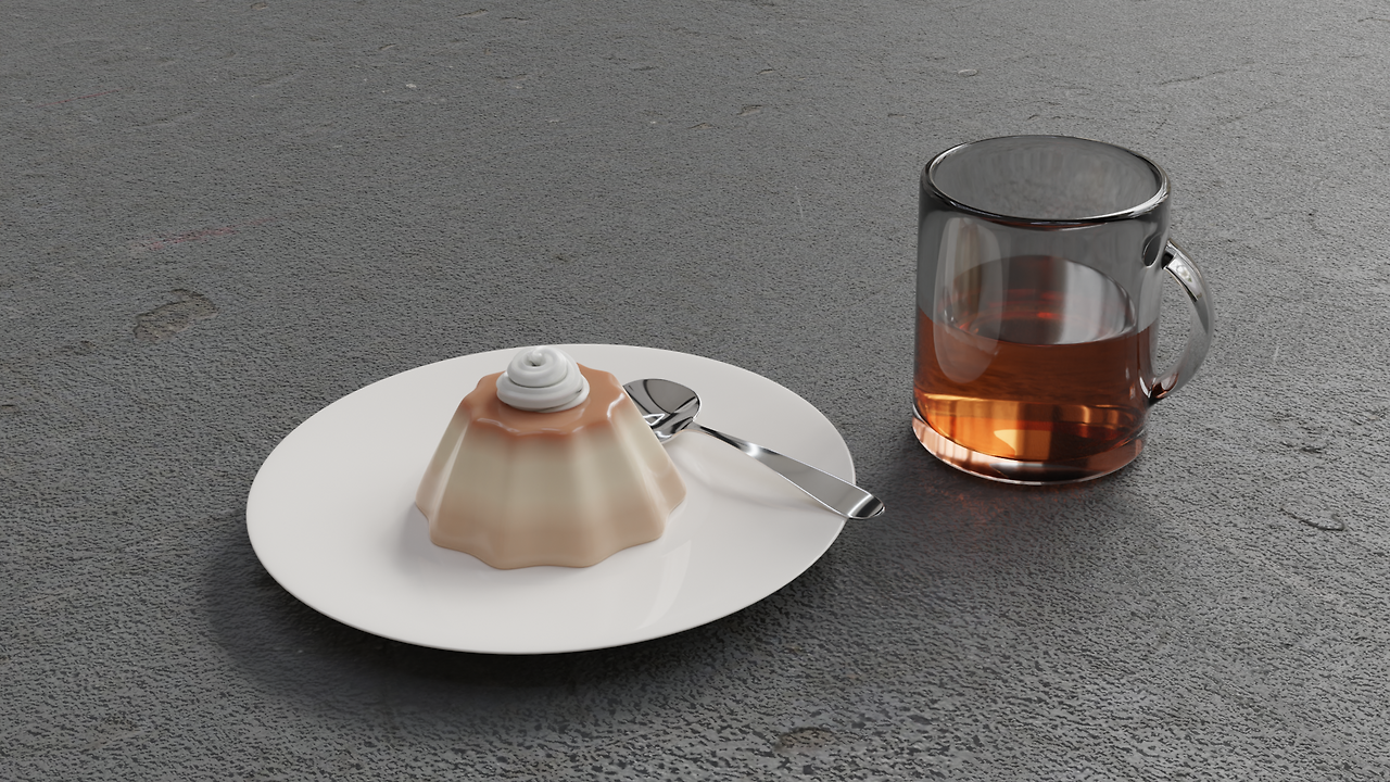 Poly Haven에서 배경 재질도 받아서 배경도 바꿔주었다. 이 배경을 바꾸지 않으면 블렌더에 들어있는 기본 배경으로 컵, 그릇, 스푼 등에 반사되어 보이는데 내가 만든 물체와 어울리지 않는 배경인 경우에는 이질감이 느껴질 수 있기 때문에 바꿔줘야 한다. 빛이 반사되는 양도 조절해서 최종 결과물은 위의 사진으로 마무리했다.