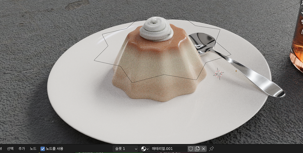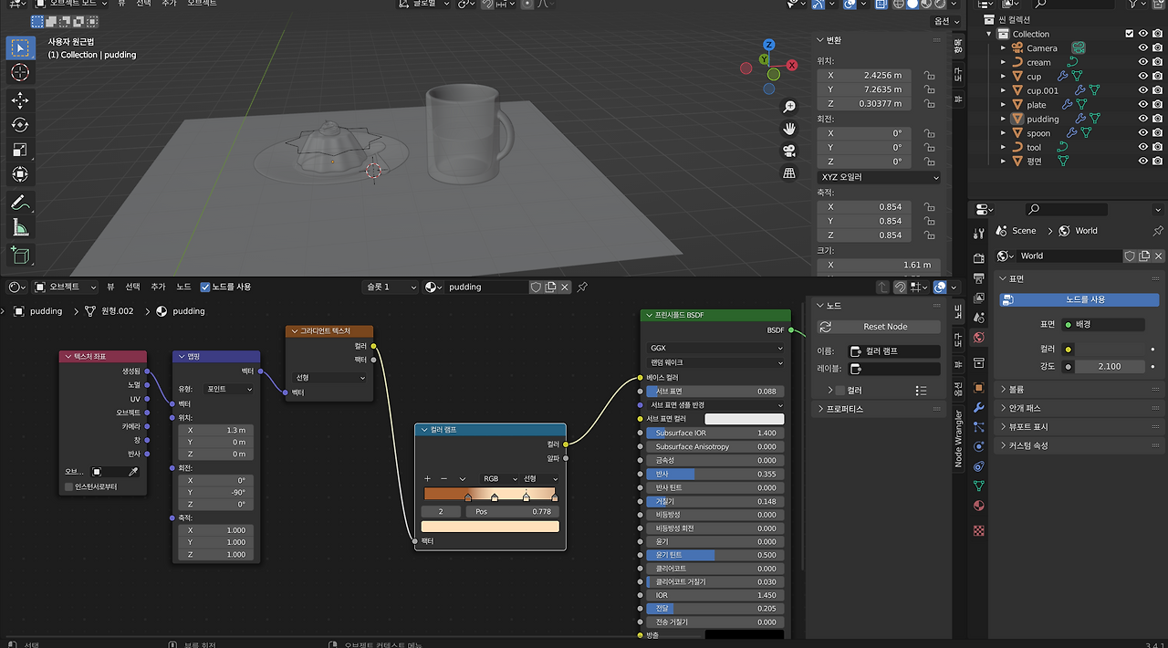 이제 필요한 것들은 다 만들어 놨고, 채색에 들어가기 시작했다. 물체를 만드는 것보다 채색과 재질을 만들어주는 게 더 어려운 것 같다. 밑에 보이는 것들을 조절해서 만들어야 하는데 내가 원하는대로 재질을 완벽하게 고르기가 여간 쉽지 않다... 특히 푸딩은 두 번의 그라데이션이 들어가는데 그라데이션을 어떻게 하는지 벌써 까먹었다. 진짜 어떻게 하더라...?