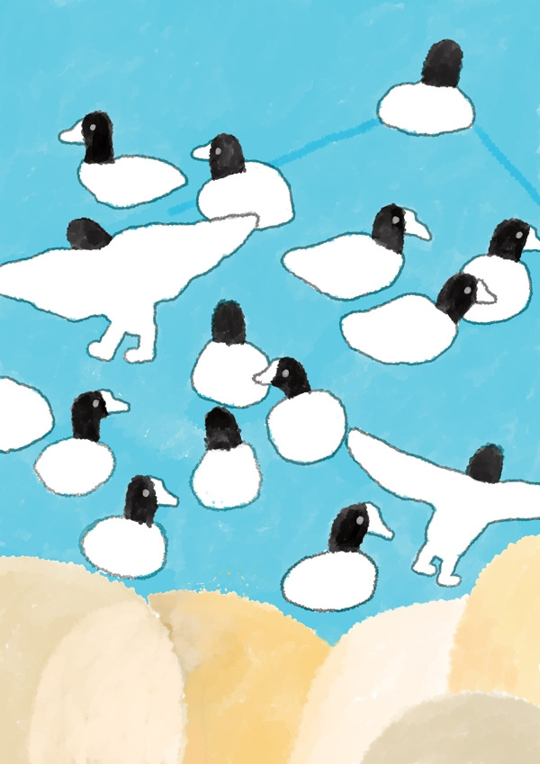갈대밭 한쪽엔 또 다른 물닭 무리가 와글와글 모여 있었다. 뽀얗게 건조된 수풀과 동그랗고 통통한 까만 새들이 기분 좋은 대조를 이루었다. 저렇게 많은 물닭들이 뭍에 나와 있는 건 처음 보았다. 나는 그들과 6~7미터 떨어진 곳에 서 있었는데 사진을 찍고 싶어서 휴대폰을 꺼냈다. 내가 팔을 쭉 뻗는 동시에 물닭들은 우르르 풍덩풍덩 물속으로 도망쳤다. 내가 너무 조심성 없이 팔을 뻗었나보다. 남색 물 위에 V자를 그리며 새의 꽁지는 허둥지둥 멀어졌다. 달아나는 물닭들이 고개를 돌려 나를 힐끔힐끔 쳐다보았다. 무안하고 미안했다. 놀래려던 게 아닌데……. 청둥오리 한 마리가 모래톱과 강의 경계선에서 우두커니 이 일을 지켜보았다. 그는 내 만행의 목격자였다.