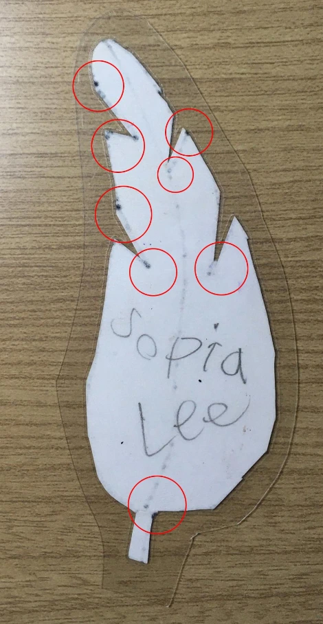 가위질에 서툴렀다거나 귀찮아서 대충 자른 게 아니냐는 의혹은 나뭇잎의 잎자루에서 묵살된다. 도화지에 인쇄된, 가위로 잘라서 가지고 노는 '종이 인형'을 떠올려보자. 종이 인형을 자를 때 최대 난이도는 인형 몸체와 인형 옷을 합체시키기 위해 디자인된 짧고 얇은 흰색 '고리'부분이다. '고리' 부분을 자르다 조금만 삐끗하면 종이 인형의 화려한 드레스 한 벌이 날아가게 된다. 이 나뭇잎 책갈피에서는 종이 인형의 '고리'보다 더 얇은 잎자루가 달려 있다. Sopia는 고도의 가위질로서 잎자루를 날려먹지 않고 정교하게 살려냈다.