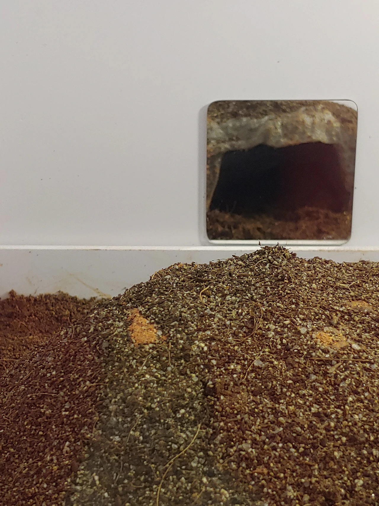 잠은 시원한 굴 속에서 자고 일어나자마자 스팟 램프 밑으로 가 체온을 높이고 있습니다.