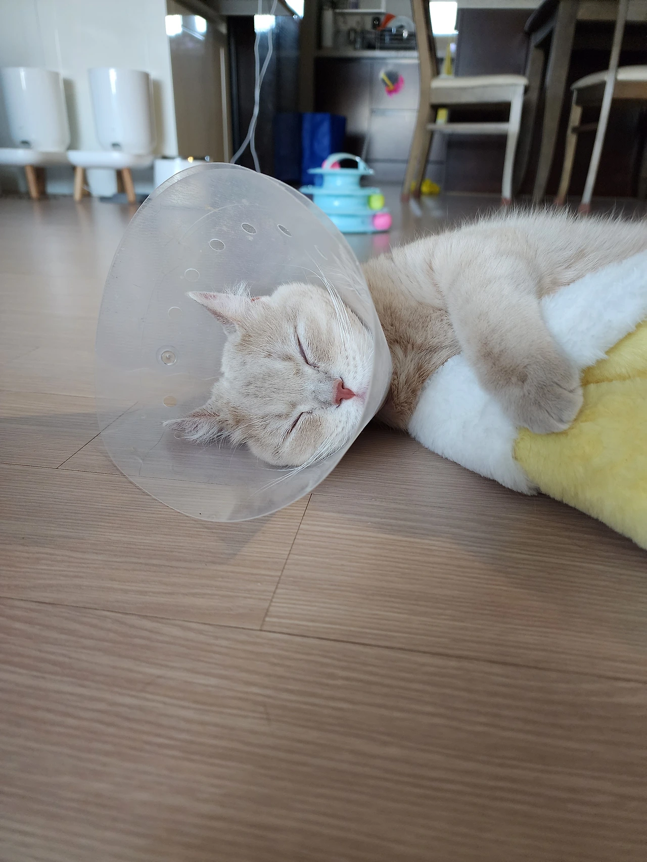 둘째냥이 중성화 수술 고깔을 벗는 날이. 우리 둘째냥이는 오늘까지 총 13일 밤낮을 고깔을 끼고 보내왔다. 지금 마루에서 자고 있다. 처음 일주일은 그래도 짧은 고깔을 썼지만 이후로 지금까지 대형 고깔을 쓰고 있다. 중간에 고깔이 바뀐 이유는 짧은 고깔을 쓰고 수술 부위를 그루밍하는 신공을 선보였기 때문이다. 너무 유연한 것도 문제다.