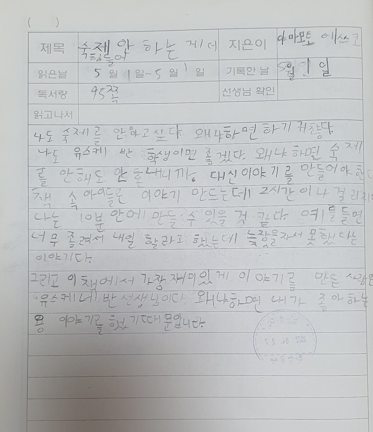 독서록도 결국은 본인의 생각을 적어야 가장 재밌다. 어른들은 뭔가 멋들어진 표현을 원하지만 사실 책을 읽고 아이들이 얻는 감상은 그렇게 깊지 못하다. 지금의 독서록도 기껏해야 ‘나도 숙제하기 싫다’, ‘내가 좋아하는 용 얘기를 한 선생님 이야기가 제일 재밌다.’ 정도의 감상평이 나왔을 뿐이다. 핵심은 ‘내 생각을 솔직히 쓴다’는 것이다. 어른들이 제일 못하게 말리는 부분이다. 단순하고 깊이 없는 감상평이 ‘성의 없게’ 느껴지는 모양이다. 하지만 그것이 아이다. 아이가 느끼는 것은 그런 것이며 아이가 할 수 있는 표현도 그런 것이다. 있는 그대로, 생긴 모습 그대로의 존중은 귀하다. 글쓰기뿐만이 아니다. 아이를 대하는 어른들의 자세는 늘 그래야 한다. 아이에게 어른의 잣대를 들이밀면 언제나 미성숙한 것뿐이다. 내가 우리 아이에게 꽤 잘하는 말이 있는데 “왜 말로 못 하고 징징거려?”이다. 사실 생각해보면 기분 나쁜 순간에 그 감정과 사건의 내막을 어떻게 말로 다 표현할 수 있겠는가. 물론 말로 하도록 가르치는 것은 맞지만, 윽박지를 일이 아니고 가끔은 그 모습 그대로도 수용해 줘야 옳은 어른의 자세가 아닐까 싶다.