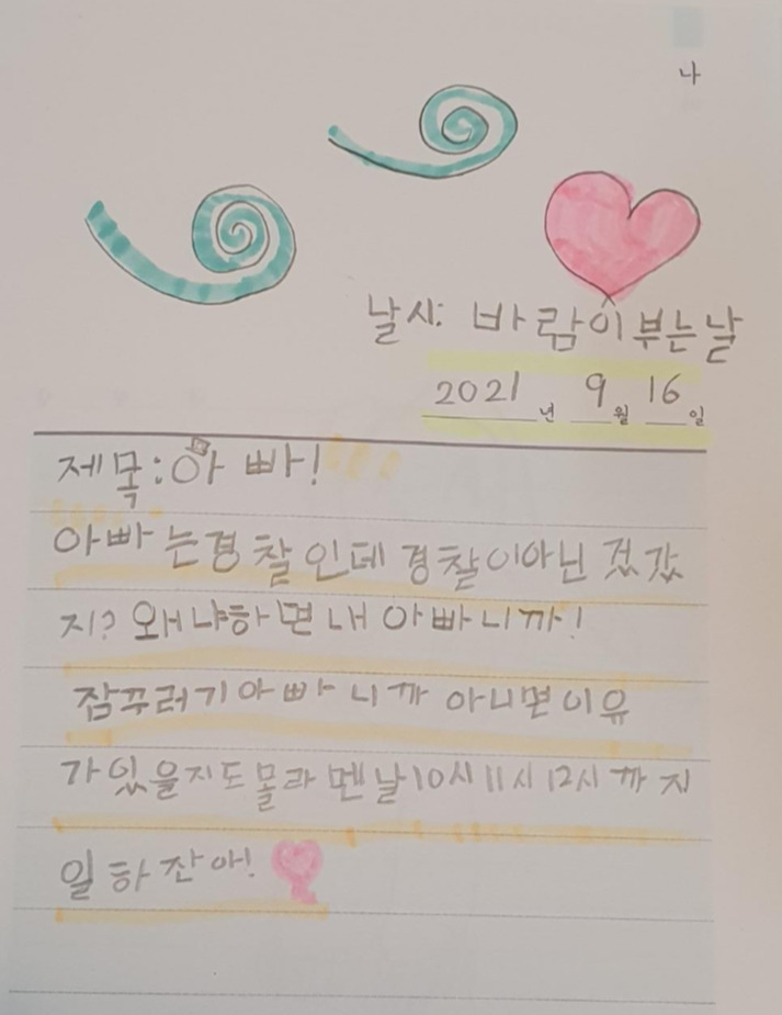 윤서는 공주님처럼 예쁜 아이였다. 공주님처럼 예쁘게 꾸미는 것도 좋아하고, 수줍게 웃는 모습도 정말 예뻤다. 엄마도 예뻤다. 그리고 두 사람은 교환일기를 쓸 정도로 알콩달콩 사이도 좋았다. 나는 중학교 때 내 단짝이랑 나누던 교환일기를 딸과 나눌 수 있다는 것이 정말 부러웠다. (난 딸이 없기에 ㅜㅜ) 그래서 윤서에게 어떤 기분인지, 교환일기가 재밌는지 물어보았다. 그런데 윤서는 몸을 살살 꼬더니 씩 웃었다. 나도 덩달아 입꼬리를 올리며 ‘그래 이제 얘기해 봐’하는 표정을 지었지만, 윤서는 내 눈을 보고 또 씩 웃기만 했다. 이럴 수가. 아이는 낯선 사람인 나와는 좀처럼 이야기를 나누지 않았다. 아이가 흥미 있을 만한 그 집 강아지 ‘초아’ 얘기를 물어봐도, 세상에서 제일 좋아한다는 엄마 얘기를 해봐도 아이는 ‘홍홍홍’ 웃기만 했다. 진땀이 났다. 오늘 무슨 얘기로 일기를 쓴단 말인가. 그때 진열장에 액자 하나가 눈에 들어왔다. 아이가 어렸을 때 경찰 옷을 입고 찍은 사진이었다. 윤서의 아빠는 경찰이었다. 뭔가 일반 사람들과는 다른 얘기가 나올법한 소재였다.