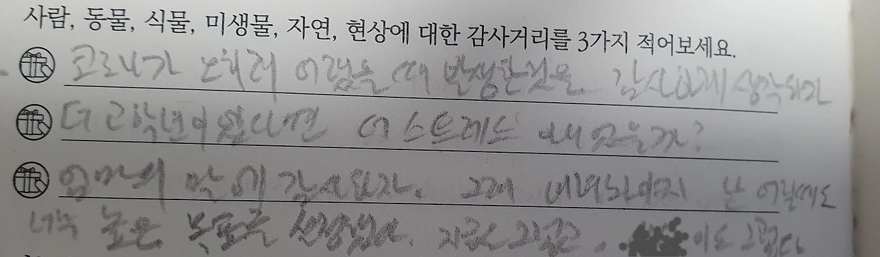 감사일기를 처음 접한 것은 앞서 언급한 적이 있는 ‘새봄 샘’ 덕분이다. 새봄 샘의 영어프로그램 중에 하루 세 가지 감사일기 적기가 있는데 처음엔 남편, 아이들, 부모님 등등 내가 생각하는 고마운 사람에 대해 적기 시작했다. 예를 들면 다정한 남편이 있어 감사하다, 귀여운 아이들이 있어 감사하다, 부모님이 계셔서 감사하다 등등이다. 그런데 이런 것이 뭐랄까, 진정으로 내 가슴 속에서 올라오는 감사가 아니라는 생각이 들었다. 그냥 일반적으로 말하는 감사에 대해 적고 있다는 느낌이랄까. 이런 것은 감사한 일이어야 한다는 학습된(?) 느낌으로 적는 감사였다. 그래서 나는 좀 더 진정으로 느끼는 감사를 찾기 시작했다.