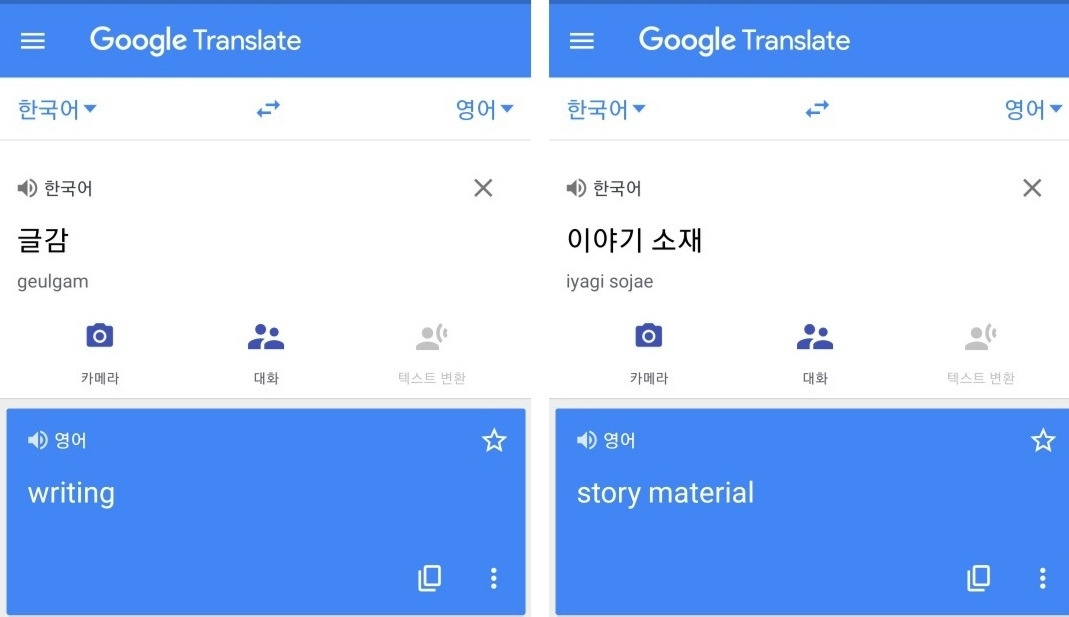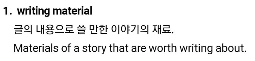 모르는 단어를 찾아가며 적게 되니 영어 공부가 된다. 지금 이 일기에서도 나는 ‘글감’을 영어로 어떻게 말하나 궁금했다. 번역기에 ‘글감’이라고 적으니 ‘writing’이라고 나왔다. 그래서 글감을 좀 더 풀어썼다. 이야기 소재라고. (우리나라는 한자어가 많기 때문에 그 뜻을 풀어서 쓰는 게 도움이 되기도 한다.) 그랬더니 ‘story material’ 이라고 나왔다. 사실 나는 ‘material’을 철이나 나무 같은 물건 만드는 재료 등으로 알고 있어서 이 단어가 틀린 거라고 생각했다. 이럴 때 나는 구글을 이용한다. 구글에 ‘글감 영어로’라고 검색을 해봤다. 그리고 실제 ‘writing material’이라는 단어를 활용한 문장을 보게 되었다. ‘아 진짜 material을 소재라는 뜻으로 쓰는구나’ 알게 되고 그대로 적용해봤다.