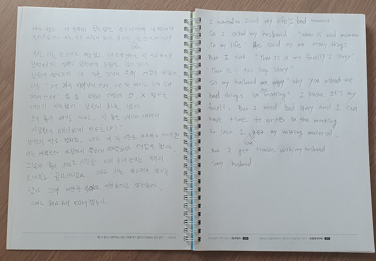 왼쪽엔 한국어로 오른쪽에는 영어로 일기를 적어보았어요.