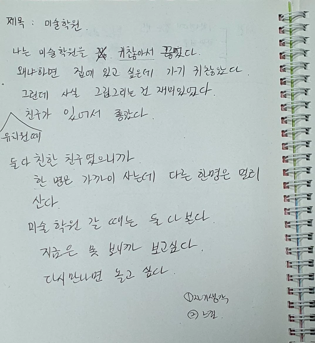 이날의 일기 소재는 ‘미술학원’이었다. 원율이는 얼마 전 미술학원을 그만뒀는데 그 이유가 ‘귀찮아서’라고 했다. 나는 무엇이 귀찮냐고 다시 물었다. 그림을 그리는 게 귀찮은지, 선생님이 시키는 것을 하는 게 귀찮은지. 그러자 아이는 ‘가는 게’ 귀찮다고 말했다. 즉 집에 있다가 학원으로 가야하는 그 행위, 그 자체가 귀찮은 것이었다. 정작 학원에서 그림 그리는 것은 좋았다고 말했다. 거기다 학원에 가면 같은 유치원 친구지만 같은 학교에 다니지 않는, 자신이 좋아하는 두 친구를 볼 수 있어 좋다고 말했다.