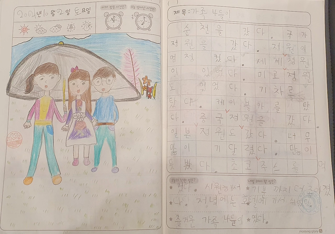 아인이의 글에는 또래 아이들처럼 그날 했던 경험들이 충실히 담겨 있었다. 그날 무엇을 했고, 어디에 갔었고 이벤트 위주의 이야기 구성이었다. 나는 아인이의 일기 중에 ‘순천만국가정원’에 다녀온 글을 보며 이날 뭐가 가장 기억에 남았냐고 물었다. 일본 정원, 중국 정원 등 각국의 정원 얘기가 적혀있었다. 그런데 아인이의 대답은 의외로 ‘호텔’이었다. 그날 호텔에서 자고 놀았던 게 가장 좋았다고 말했다. 하지만 호텔 얘기는 마지막 줄에 ‘호텔에 가서 쉬었다’가 전부였다.
