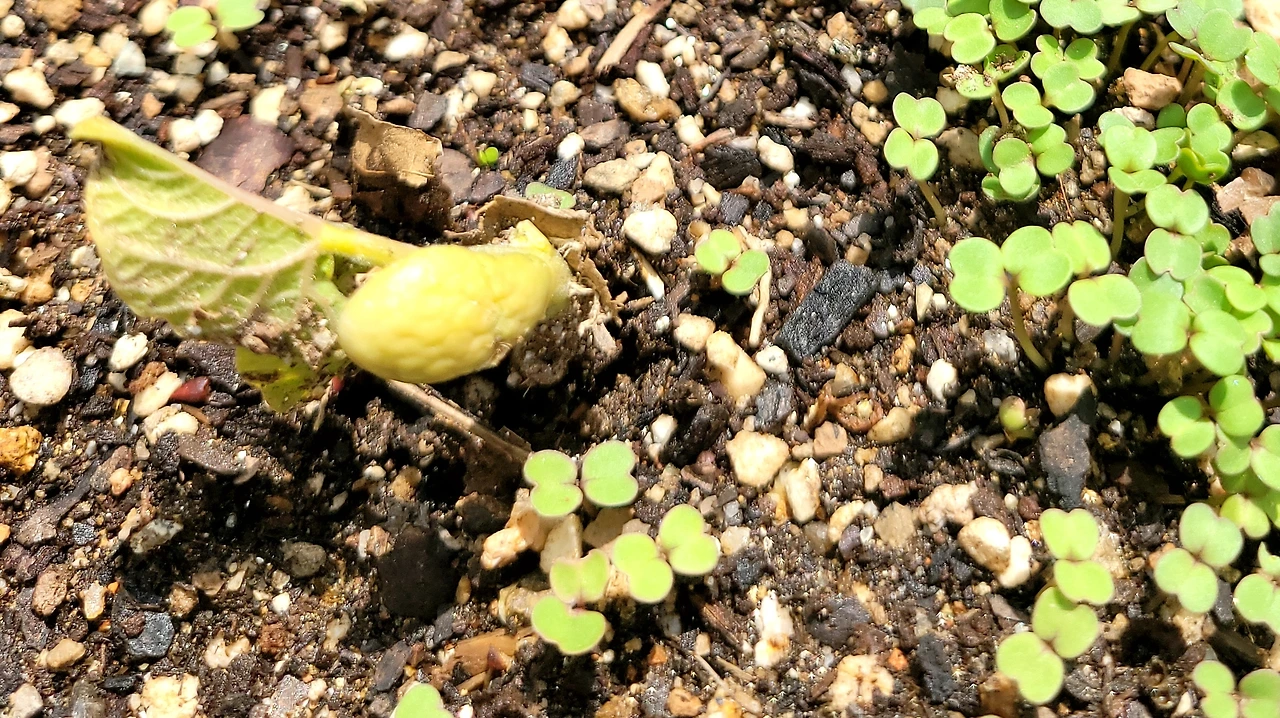 처음에는 루꼴라 군단에 넋이 나가 발견하지 못했다. 뭔가 낙엽이 떨어졌나 주으려고 보니 강낭콩싹들이 어린 고개를 빼꼼이 내밀었다.