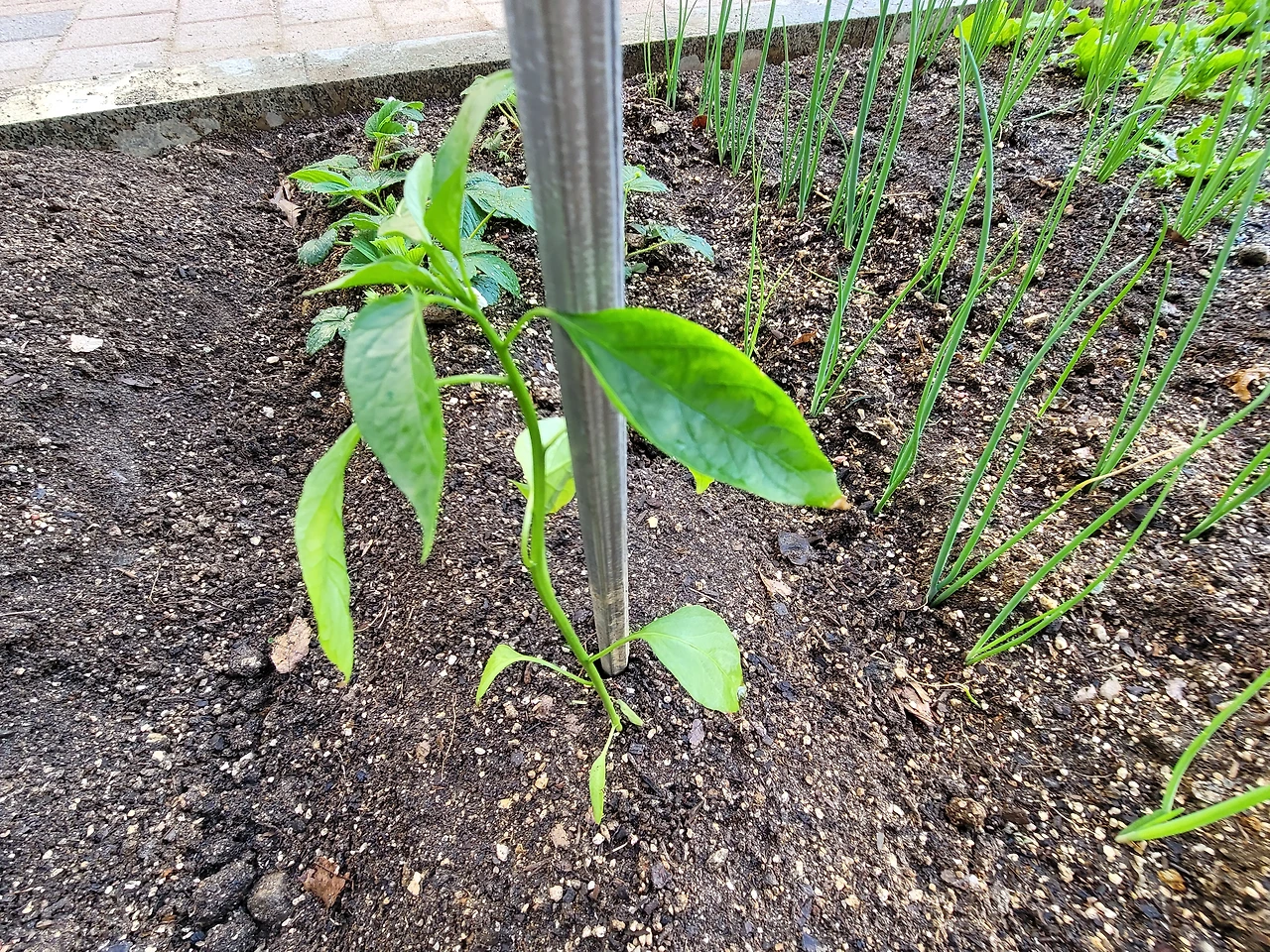 고추랑 방울토마토는 모종당 30cm정도 띄워서 심어야 잘자란다. 지주대도 옆에 세워주었다. 고추는 힘이 없어 지주에 노끈으로 8자로 넉넉하게 묶어주었다.