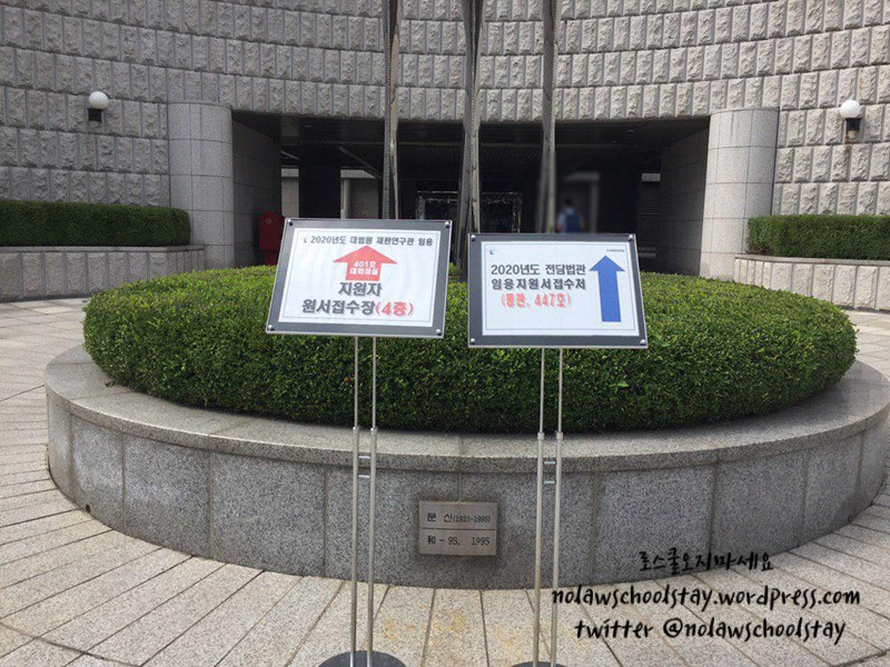 예전 블로그에서 가져온 거라 서명이 워드프레스로 되어 있다. 대법원 앞, 지원자 원서접수장(4층) 화살표 안내문이 서 있다.