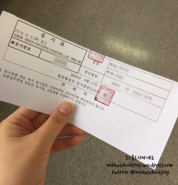 왼손으로 응시표를 들고 있는 사진. 2019.9.5.공고 대법원 재판연구관 채용시험이라고 적혀 있고, 내 이름과 생년월일, 응시번호, 접수일자, 도장 등은 블러처리했다.