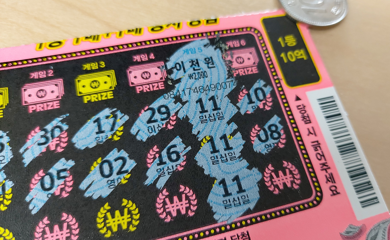 남편이 선물 받았다며 준 복권. 이천 원에 당첨됐으나 돈 받으러 왔다 갔다 하는데 드는 차비가 3천 원이라 수령 포기.