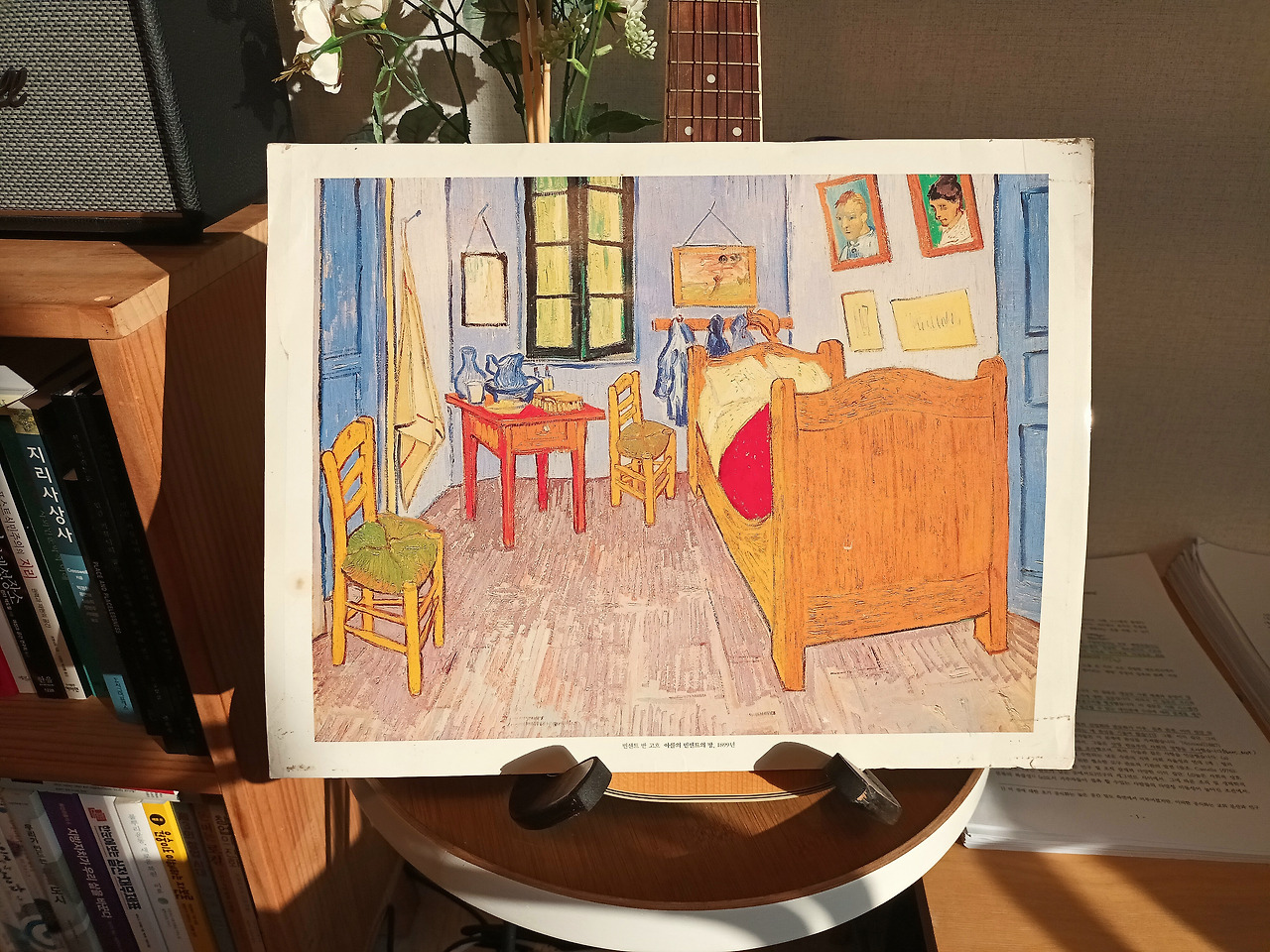 작업실에 굳이 침실을 만들어 노란 체크무늬 커튼을 달고, 노란색 베개와 연노랑 이불, 노란 액자, 노란 벽시계까지 걸어 방을 온통 노란색으로 채운 이유가 이 그림 때문이었을지도 모른다는 생각이 들었다. 아마도 나는 세상이 알아주지 않는 작품세계로 고단했던 그의 심신을 위로해 준 나무 침대와 작은 테이블, 두 개의 의자, 그리고 벽에 걸린 액자 몇 개가 다인 고흐의 방과 노란빛을 무의식 중에 저장해 놓았던 모양이다.