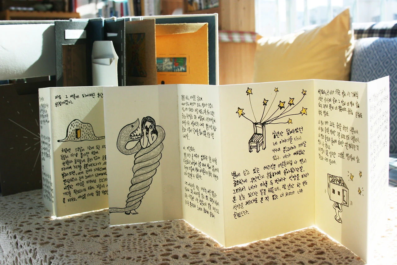 집에 있는 종이들을 활용해 봉투를 만들어 붙이고, 여러 장의 종이에 그림을 그리고 펜으로 편지글을 옮겨 적었다.