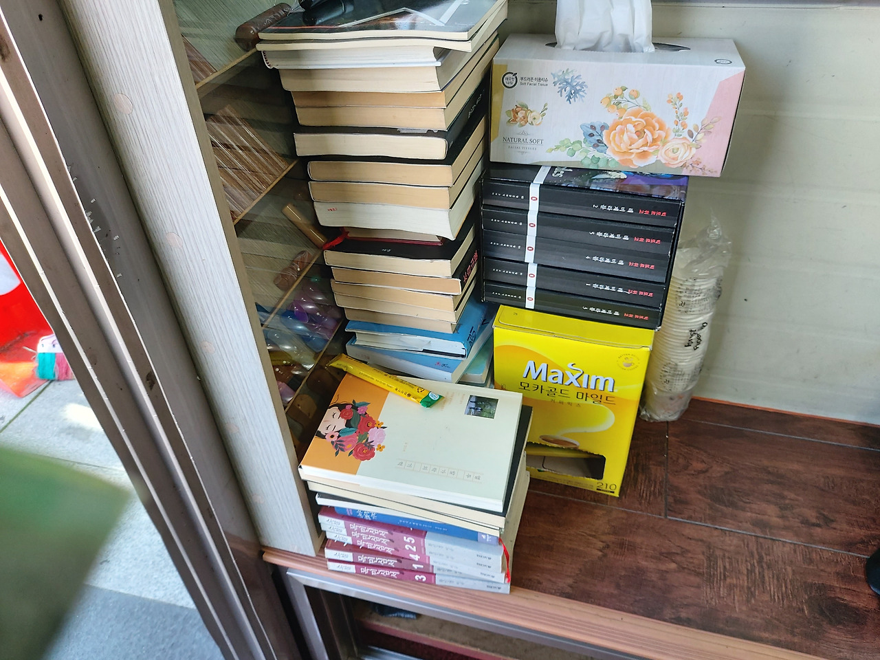 막 쌓아놓은 것 같으면서도 나름 깔끔하게 정돈된 책들. 믹스커피 박스와 갑 티슈 사이에 가지런히 쌓인 펭귄클래식 코리아의 <레미제라블> 5권