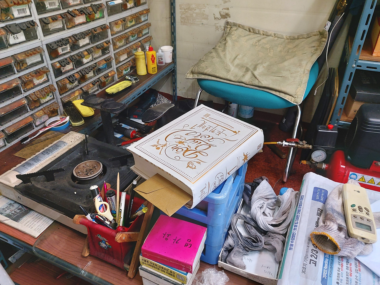 대부분의 도장집은 비좁은 공간에 잡다한 물건들이 가득하다. 이 곳도 예외는 아니었다. 바닥 한쪽에 일렬로 자리한 생수병부터 가스버너, 전기주전자, 에어컨과 겨울용 히터까지 사계절을 나는데 부족함이 없어 보였다. 거기다 도장뿐 아니라 열쇠제작과 구두 닦기까지 세 가지 업무가 가능한 공간이다 보니 온갖 물품이 출입문을 제외한 3면의 바닥부터 천장까지 가득했다.