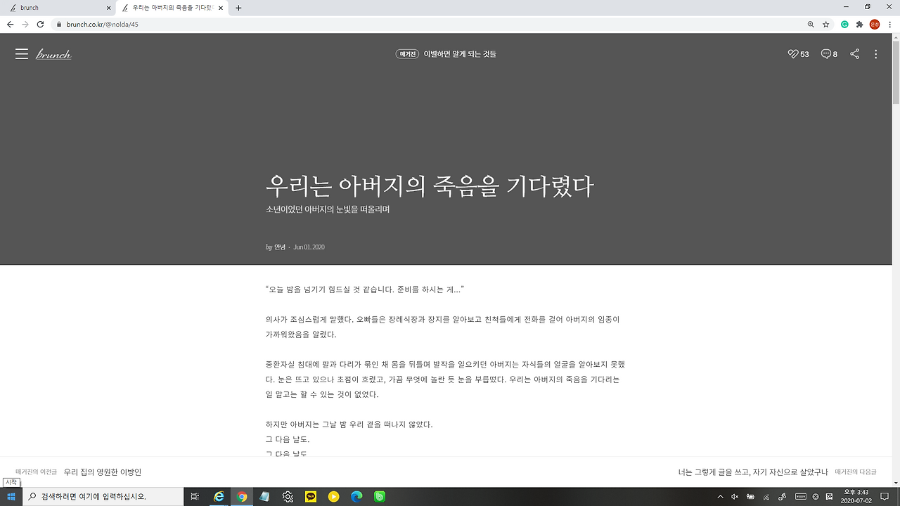 가끔은 최근에 올린 글보다 한참 전에 써 둔 글의 조회수가 더 나오는 날이 더러 있다. 한 달 전에 쓴 아버지의 죽음에 대한 글은 매일 글 통계 순위 3위 안에 오르내리곤 하는데 이상한 건, 오르는 조회수에 비해 라이킷 수는 제자리라는 것이다. 우리는 아버지의 죽음을 기다렸다