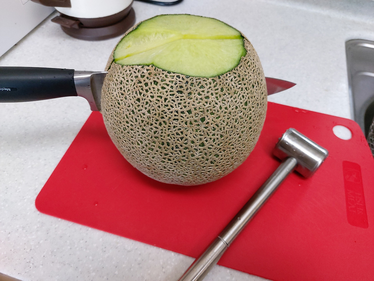 제사를 지내고 남은 멜론을 혼자 쪼갤 수 없어서 사용한 방법. 왼손으로 식칼을 가운데에 살짝 꽂은 다음 고기 망치로 칼을 두드려 깼다. 이런 식으로 사과와 단감도 혼자 쪼개 먹었다