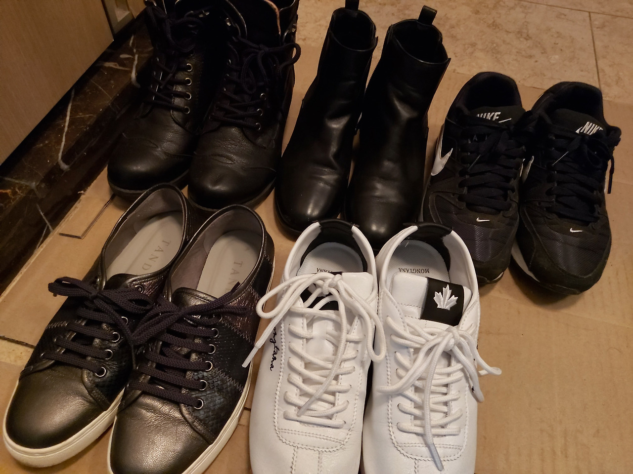 당근에서 구입한 검은색 신발 네 켤레와 흰색 신발 한 켤레. 하지만 원래 습관대로 한 켤레만 매일 신고 다닌다.