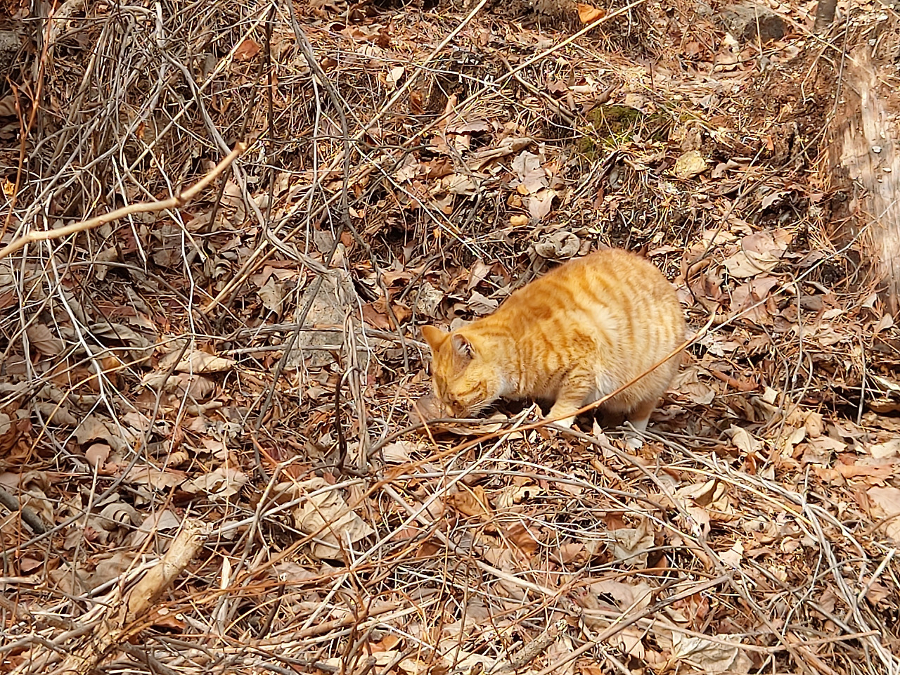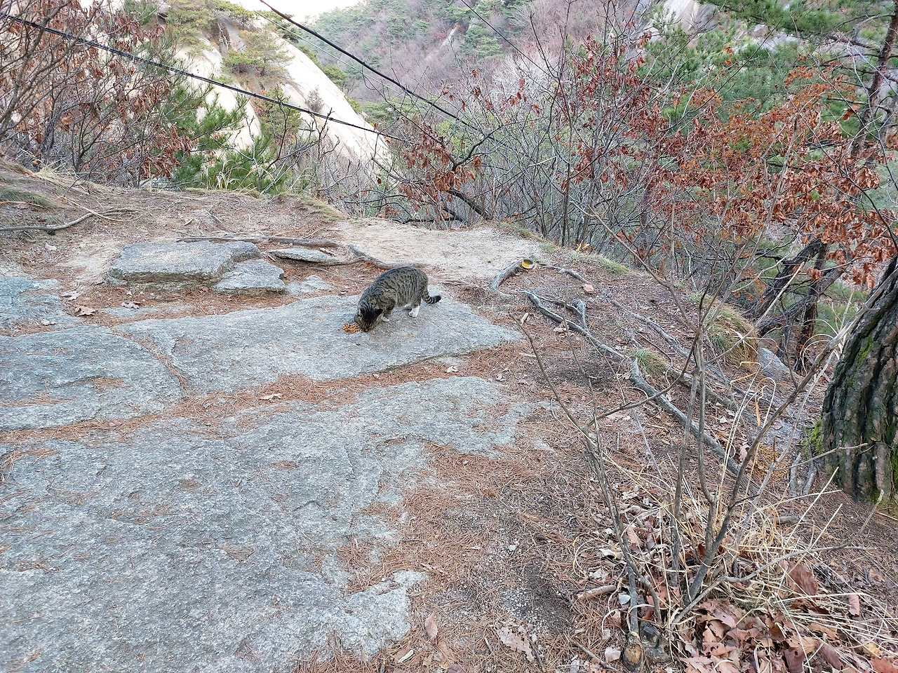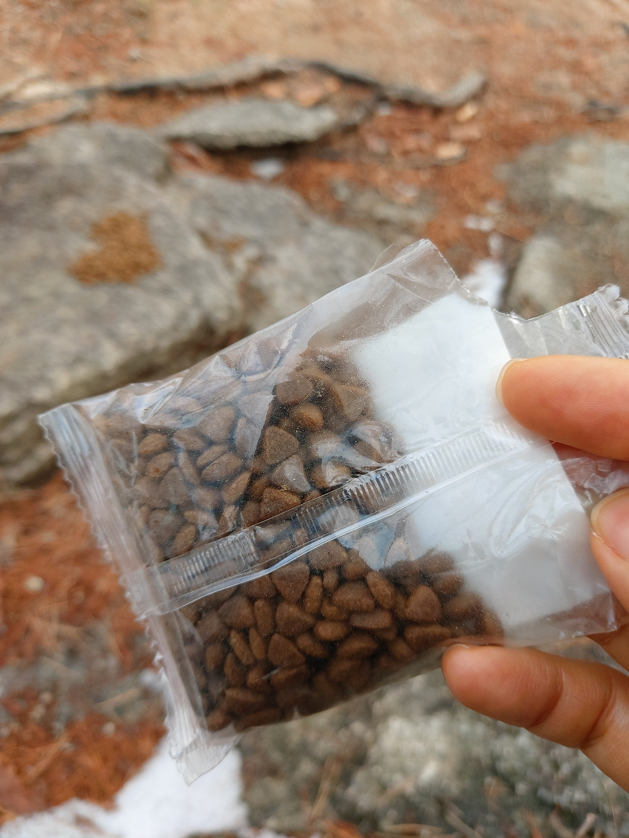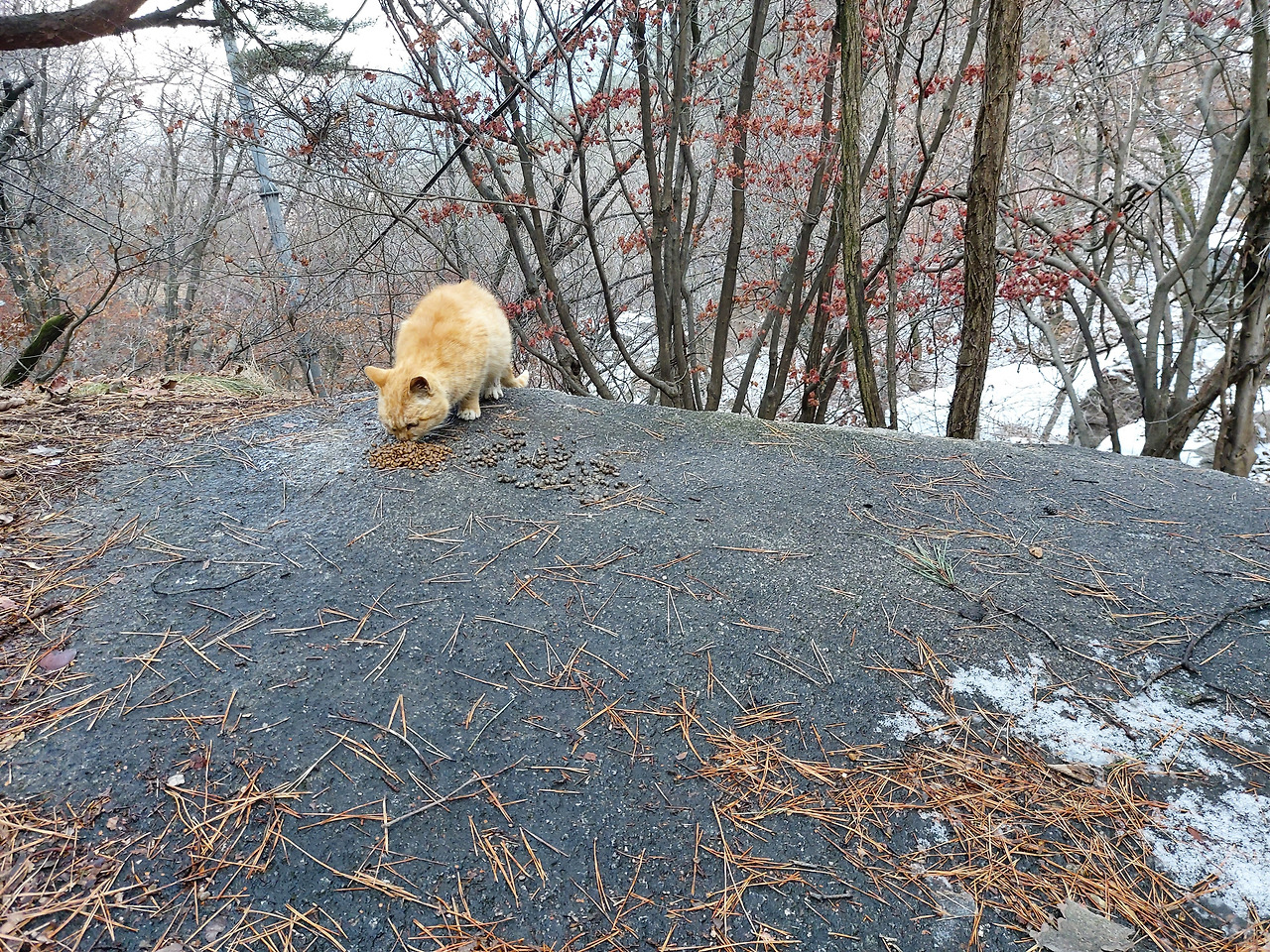 고양이들의 시선을 따라 왼쪽으로 고개를 돌려보았다. 비슷한 덩치의 까만 고양이 한 마리가 너른 바위 위에서 뭔가를 먹더니 인기척에 놀라 후다닥 건너편으로 뛰어갔다. 산속에 사는 고양이가 바위 위에서 먹을 만한 게 뭘까.가까이 다가가 보니 고양이 사료였다. 캣맘은 골목길에만 존재하는 게 아니었다. 갑자기 집에 있는 사료 샘플들이 떠올랐다. 아이가 여기저기서 얻었는데 새끼용 사료라 정작 집에 있는 고양이는 먹지 못한다고 했다. 그 후로 나는 조금씩 포장된 고양이 사료를 한 두 개씩 들고 산에 올랐다.